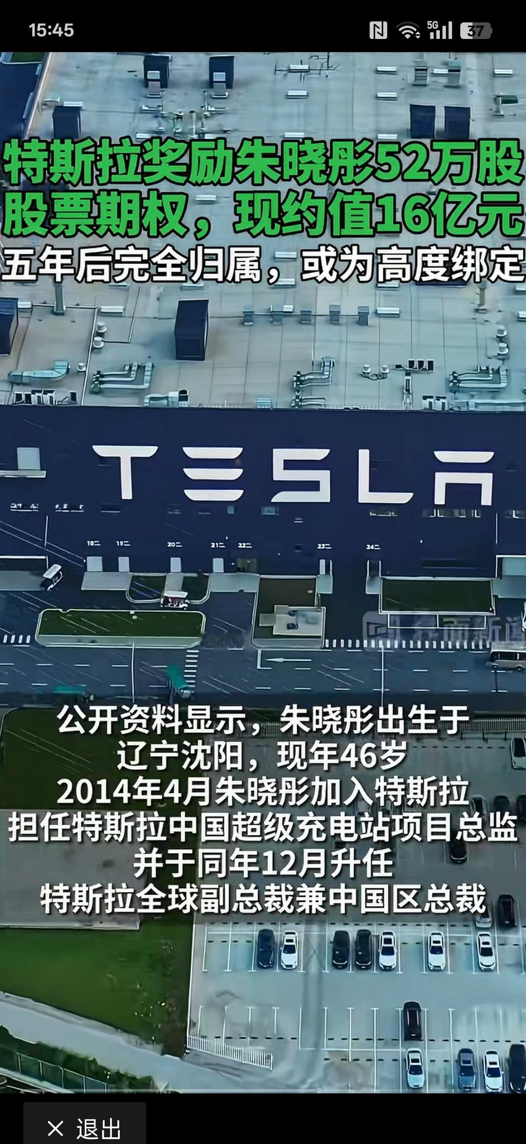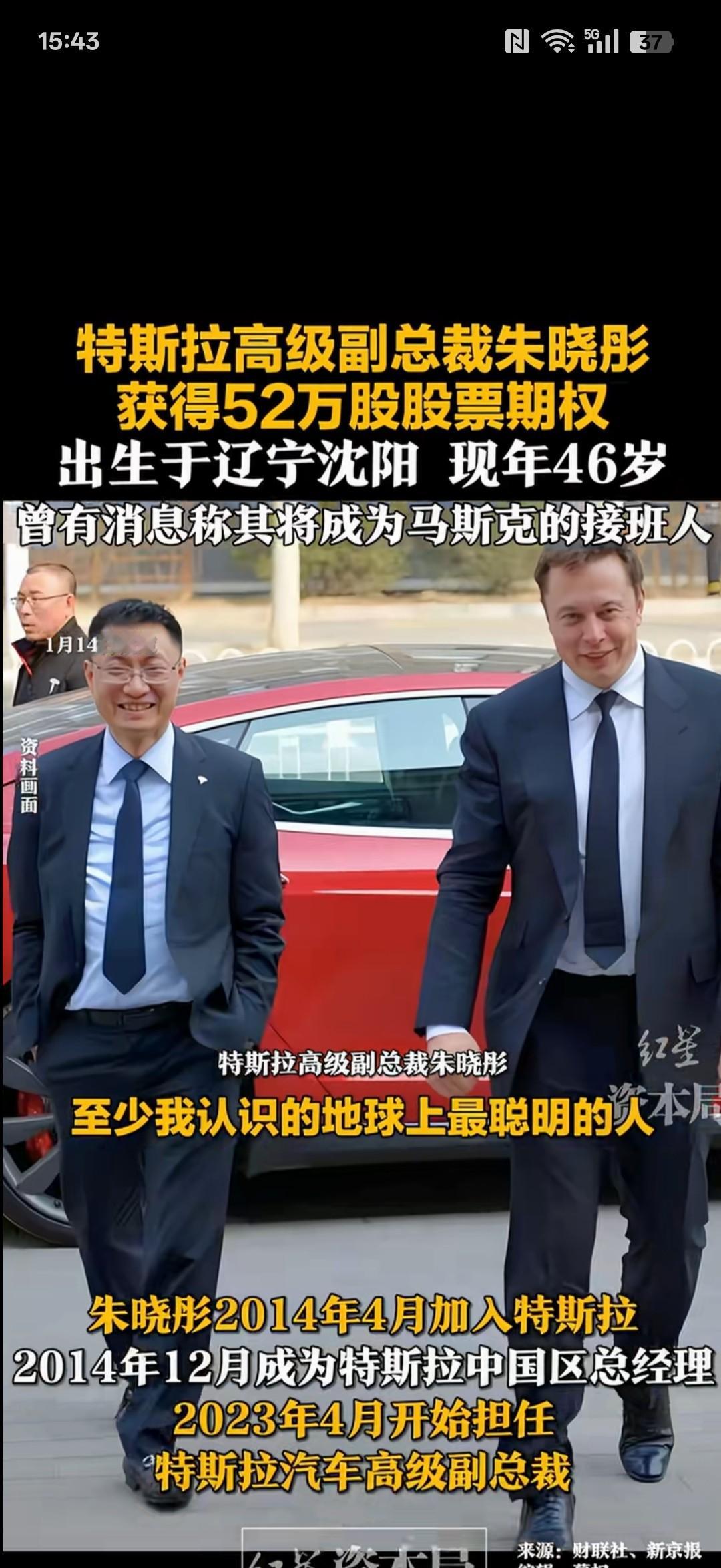 特斯拉中国总裁朱晓彤,52万股股权直接到账,16亿现金砸脸。