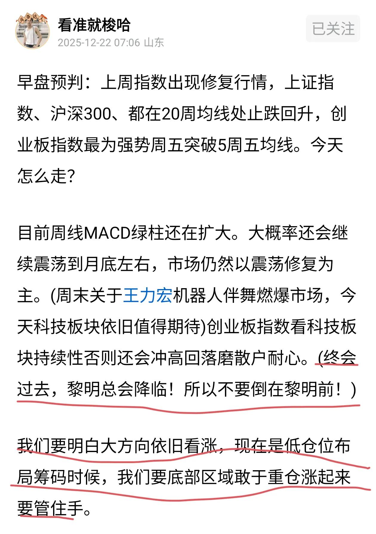 早盘预判:上周降温措施下上证指数迎来调整周期,周五上证指数有反弹预期技术层面看涨但是下午继续控温导致继续回调(利用300ETF放巨量卖出)虽然上证指数回调但是机器人板块和科创芯片设备双双大涨。 目前需要健康慢牛不要疯涨那么本周初会为调整震荡为主,往下空间基本在4020左右目前4190点位会成为1月份最高点。(虽然指数看调整但是手中科技板块看轮动上涨) 1月份上证指数4190点位点位会成为全年最高点吗?并不会最快2月份就可以再次突破走慢牛被继续控温那么3月份一定会突破。 A股震荡行情中如何做波段 人在什么情况下才能大彻大悟