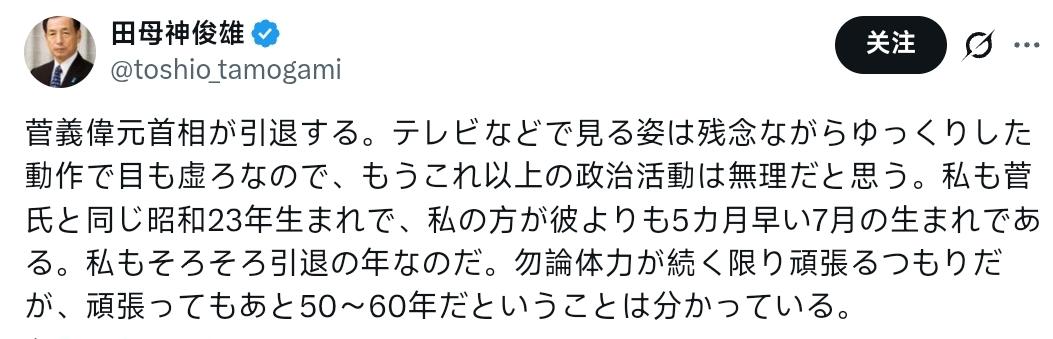 日本前航空参谋长田母神俊雄:前首相菅义伟即将退休。可惜的是,每次在电视上看到他,他动作都很迟缓,眼神也有些空洞,所以我觉得他已经无法继续从事政治活动了。我和菅义伟同年出生于1948年,但我出生在七月,比他早五个月。我也差不多该退休了。当然,只要还有精力,我打算继续工作,但我知道,即便我竭尽全力,也只能再活五六十年了。