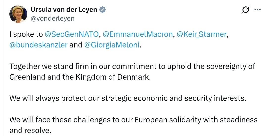 欧盟委员会主席冯德莱恩: “我们与北约秘书长吕特、法国总统马克龙、英国首相斯塔默、德国总理梅尔茨以及意大利总理梅洛尼进行了通话。我们共同坚定承诺维护格陵兰以及丹麦王国的主权。我们将始终保护我们的战略经济和安全利益。我们将以坚定和决心的态度面对对欧洲团结的这些挑战”。