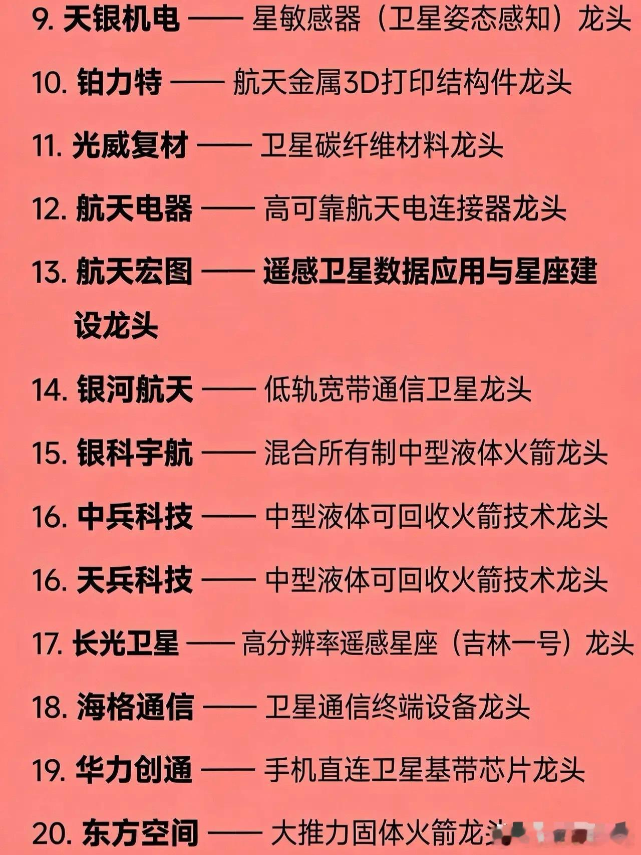 商业航天领域20家核心龙头企业中国卫星 —— 卫星整机制造龙头中国卫通 —— 卫星通信运营龙头蓝箭航天 —— 民营液氧甲烷可回收火箭龙头星河动力 —— 民营固体火箭发射龙头航天电子 —— 火箭/卫星测控与电子系统龙头航天动力 —— 液体火箭发动机龙头铖昌科技 —— 星载T/R芯片龙头臻镭科技 —— 卫星射频与电源管理芯片龙头天银机电 —— 星敏感器(卫星姿态感知)龙头铂力特 —— 航天金属3D打印结构件龙头光威复材 —— 卫星碳纤维材料龙头航天电器 —— 高可靠航天电连接器龙头航天宏图 —— 遥感卫星数据应用与星座建设龙头银河航天 —— 低轨宽带通信卫星龙头中科宇航 —— 混合所有制中型液体火箭龙头天兵科技 —— 中型液体可回收火箭技术龙头长光卫星 —— 高分辨率遥感星座(吉林一号)龙头海格通信 —— 卫星通信终端设备龙头华力创通 —— 手机直连卫星基带芯片龙头东方空间 —— 大推力固体火箭龙头