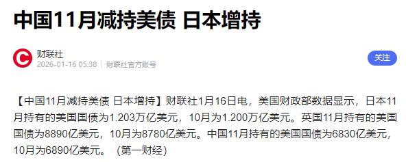 美国很慌,中国抛售美债 美国财政部在1月15日发布的数据显示,中国继续减持美债。11月持仓已经下降至约6830亿美元,达到自2008年以来的最低水平。这也是中国连续第9个月净卖出美债。 对于美国政府来说,这是非常不利的。中国的综合实力和影响力摆在那边,如果继续抛售美债,可能会引起更多国家和地区的跟风。 美国政府的慌不是空穴来风。美国国债总规模早已突破38万亿美元,每年光利息支付就高达1.4万亿美元,这个数字占联邦财政收入的四分之一以上。美国政府常年靠增发国债弥补财政缺口,海外投资者的购买意愿直接决定美债发行是否顺畅。 中国作为全球主要美债持有国之一,持续减持的动作正在动摇市场信心。其他国家和地区看到中国的操作,难免会重新评估美元资产的安全性。毕竟在全球金融市场,中国的资产配置方向向来具有风向标意义。 中国的减持绝非一时冲动,而是长期战略调整的体现。这几年中国一直在优化外汇储备结构,通过减美债、增黄金的方式分散风险。中国黄金储备已连续14个月增持,规模不断刷新纪录。这种操作本质是把外汇储备的安全主动权握在自己手里。 美国自身的政策混乱加剧了这种担忧。特朗普政府推行的减税政策收缩了财政收入,同时又扩大政府支出,赤字缺口只能靠发债填补。更关键的是,美国还频繁干预美联储决策,试图迫使央行配合政治议程,这种行为直接破坏了央行独立性。 央行独立性是美元信用的重要基石。如今这一基石被动摇,全球投资者对美元资产的信任度持续下滑。美元在全球外汇储备中的占比已降至数十年来低位,这就是市场用脚投票的结果。 为了稳住中国减持的节奏,美国近期放出了所谓的善意。特朗普政府下达总统令,批准英伟达向中国出口H200芯片。但这招根本打错了方向。 这份出口许可附带了一堆限制条件。相关出口要逐案审查,还要征收25%费用,出口数量也不能超过美国市场总产量的50%。而且H200芯片已非英伟达顶尖技术,该企业早已量产更先进的芯片型号,即便出口也不会影响美国在人工智能领域的领先地位。 美国这么做,更多是为了挽救本国企业利益。此前美国的芯片封锁政策,让英伟达在中国市场的份额从高位骤降至零,大量H200芯片囤积库存。中国国产芯片产业也趁机崛起,华为昇腾、寒武纪等品牌已能对标H200,市场份额持续提升。 中国抛售美债的核心诉求是保障资产安全,而非针对美国的反击行为。只要美元资产的安全性无法得到保障,中国优化外汇储备配置的趋势就不会改变。美国想用落后芯片换取中国停止减持,显然没摸透中方的核心逻辑。 全球资金流向已出现明显变化。英国目前持有美债规模超过中国,成为第二大海外持有国,日本仍是最大持有国,但持仓也有波动。这说明全球资金正在重新配置,对美债的态度出现分化。 美国的困境还不止于此。美联储主席鲍威尔正面临调查,特朗普团队已放风要更换美联储主席人选。这种操作进一步加剧了市场对美国货币政策稳定性的担忧,美债收益率随之波动,美元指数持续走弱。 美国政府陷入了政策矛盾的怪圈。一边要靠发债填补赤字,一边又用各种手段破坏美元信用。一边想通过贸易施压,一边又希望其他国家增持美债。这些相互冲突的目标,让美国在应对中国减持时显得力不从心。 中国的减持节奏始终保持稳健,没有短期大规模抛售引发市场震荡,也没有完全退出美债市场。这种可控的调整方式,既保障了自身利益,也为全球金融市场留出了适应空间。 对美国来说,真正该慌的不是中国的减持动作,而是自身政策的内在缺陷。只有修复美元信用、理顺财政与货币政策的关系,才能重新吸引全球资金持有美债。靠小恩小惠的试探,根本解决不了核心问题。
