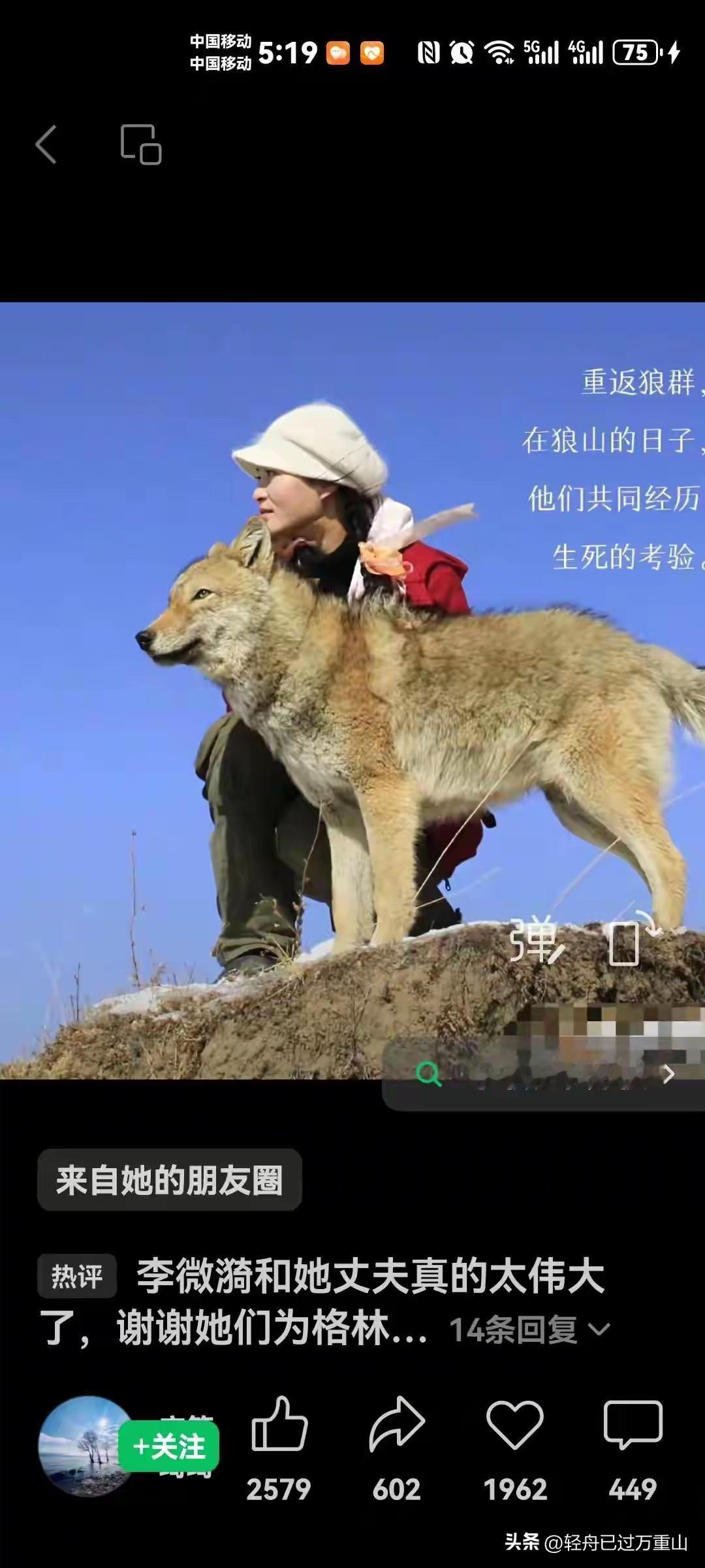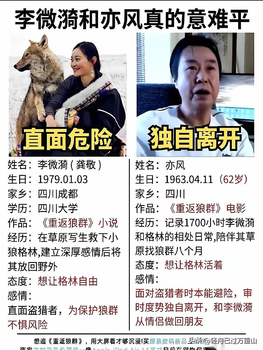 李微漪7年拍狼,成就了一部《重回狼群》的纪录片,但是她和男友亦风分手了 ,他们相识于2009年,那时李微漪30岁,亦风已46岁… 2010年4月,李微漪独自在若尔盖大草原写生时意外救下小狼崽“格林”并带回成都家中抚养,从此,亦风便与李微漪一起为“格林”,为保护野生狼群而奔忙,这一奔忙就是整整十六年… 李微漪为格林疯狂,卖掉成都的房,耗光七年积蓄,最后两个人散了。 原始素材攒1700小时,草原蹲7个月,从夏熬到-40℃的冬。 啃冻硬的馍,睡漏风的帐篷,只为了拍出最真实的狼群生活。 只是,有一天,黑洞洞的偷猎者的猎枪对着他们两人时,为了自保的亦风逃走了,李微漪很失望,认为他抛弃了她,于是两人毅然决然分手,但是两人至今依然单身,亦风未娶,李微漪未嫁,她这一辈子的青春都给了狼王格林。 李微漪是一个传奇女子,注定她领养的格林也是一个传奇,可以说没有李微漪就没有狼王格林。因为格林身世可怜,才出生5天,它的父母就被盗猎者打死了,外出若尔盖大草原写生的李微漪把它带回重庆,像养宠物一样养着这匹狼。 随着格林野性渐显,李微漪卖掉画室,带它回到4000米的无人区,对其进行野化训练,教它捕猎、练狼嚎。2011年初,格林成功融入狼群,并在2013年成为统领12匹狼的狼王。但是它没有忘记带大它的李微漪,它已经把她当成自己的妈妈。 有一个泪点就是李微漪在和亦风拍狼群时,躲在小木屋里面没有干粮吃了,只剩最后两块压缩饼干的时候,他们把格林藏在雪里的兔子拿出来吃了,但是格林发现的时候并没有发怒,而是把那两块压缩饼干吃了以后重新去捕猎了一只兔子来埋在以前的位置,就怕他李微漪找不到,这一段真的很感动。 格林没有口袋,但是小时候李微漪用来捆在它脖子上的红丝带它一直保存着,后来还把丝带还给李微漪,它知道李微漪会来大草原看它,但是有了狼宝宝后,成为狼王的它只能和李微漪保存距离,只能远远看着,不敢亲近。 李微漪是一个传奇女子,亦风也是一个传奇,他们两人的付出成就了一匹创奇的狼格林,遗憾的是两人因为误会没有在一起,但是他们一定把对方的爱藏在内心 就像格林,它爱李微漪,但是它永远藏在内心。