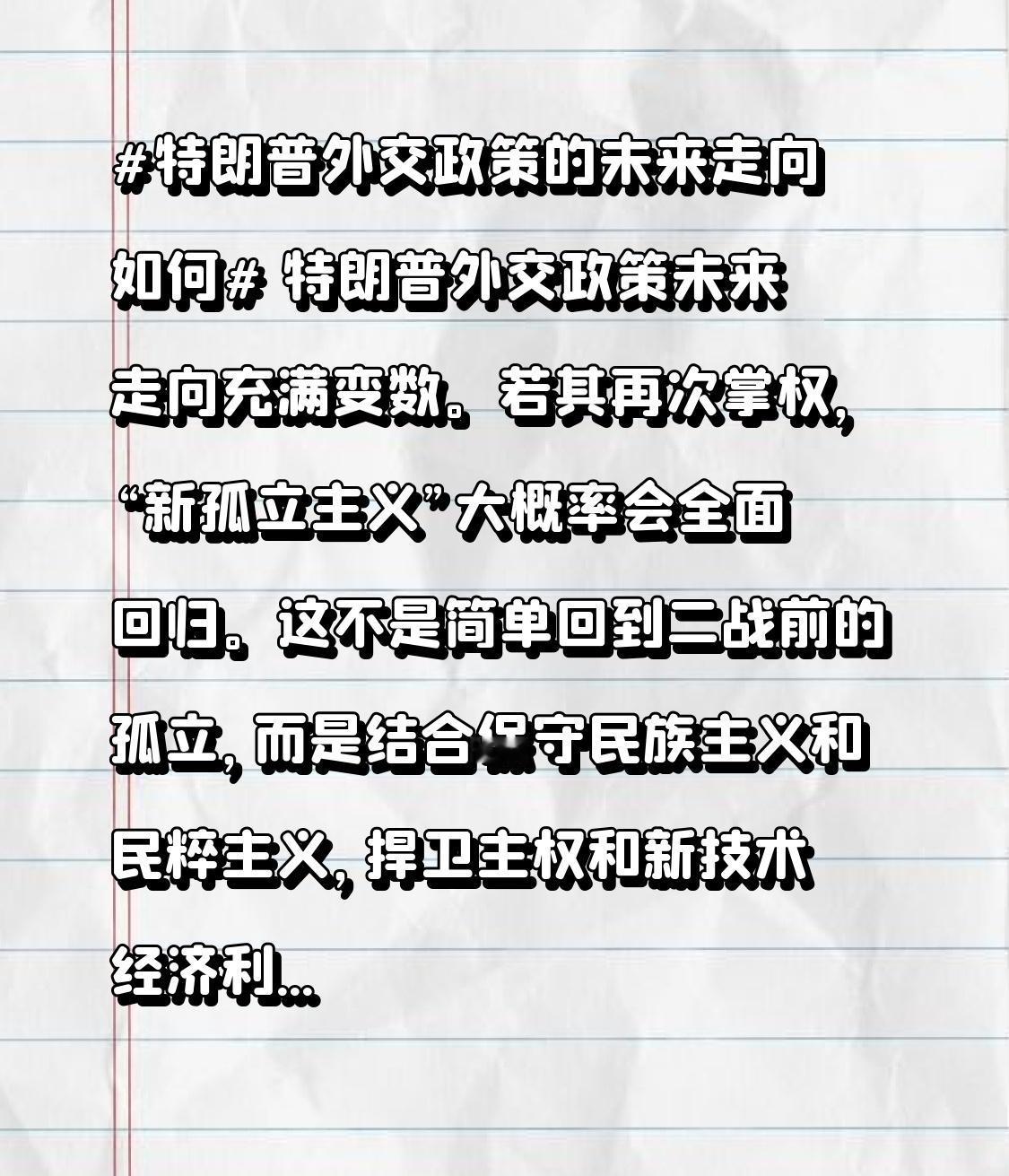 特朗普外交政策未来走向充满变数。若其再次掌权,“新孤立主义”大概率会全面回归。这不是简单回到二战前的孤立,而是结合保守民族主义和民粹主义,捍卫主权和新技术经济利益,虽以“美国优先”为核心,也有“保守国际主义”元素。 在科技外交上,会在“新孤立主义”与“保守国际主义”间找平衡,可能从“小院高墙”走向“多极互惠联盟”。 俄乌问题上,他“用资源换援助”的计划引发轩然大波。这让俄乌冲突走向更难预测,未来他或许还会为了美国利益在其中不断搅局。