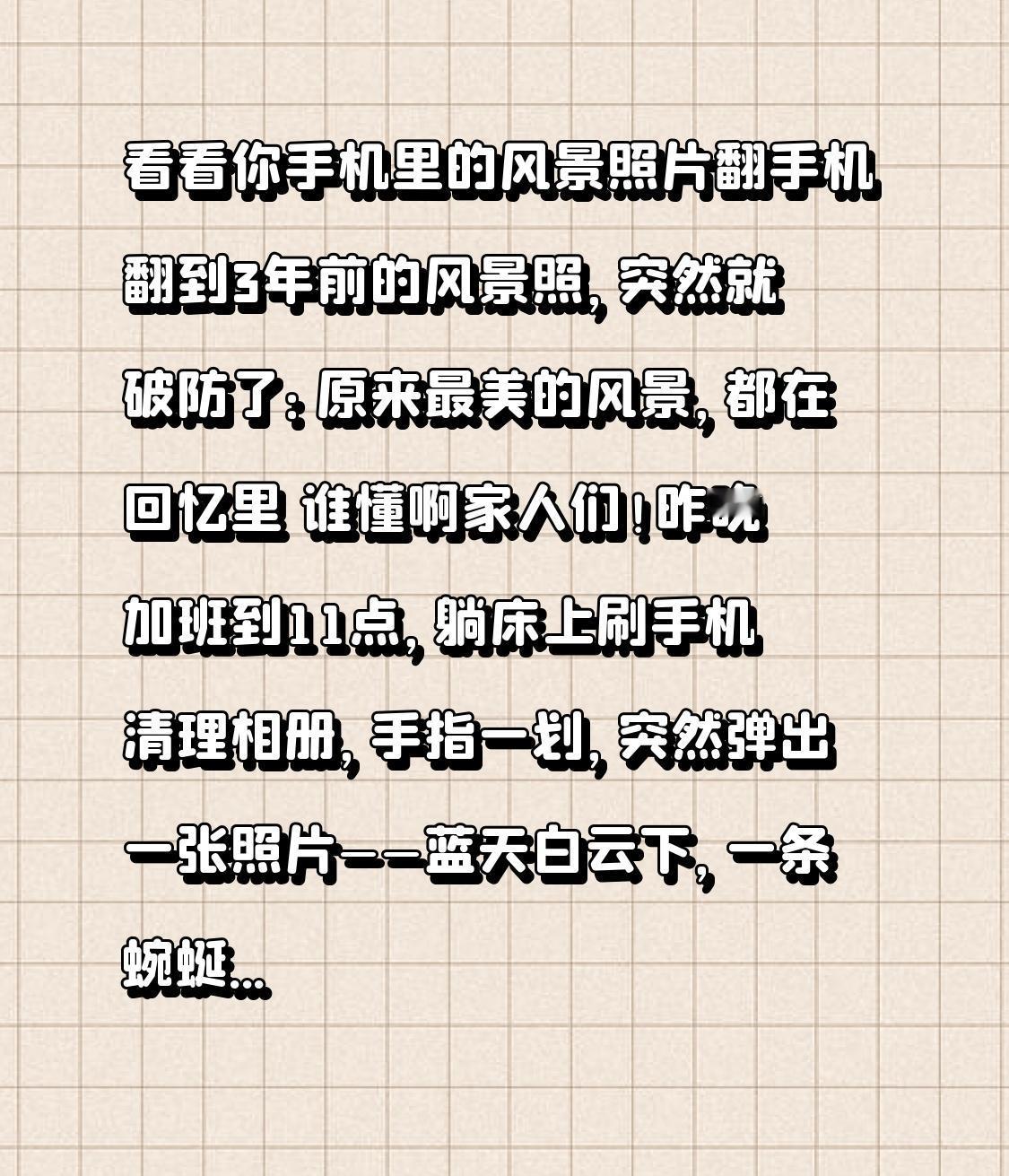 看看你手机里的风景照片 翻手机翻到3年前的风景照,突然就破防了:原来最美的风景,都在回忆里 谁懂啊家人们!昨晚加班到11点,躺床上刷手机清理相册,手指一划,突然弹出一张照片——蓝天白云下,一条蜿蜒的乡间小路,路边全是金黄的油菜花,照片角落还露出半只沾着泥点的小白鞋。 我盯着照片愣了足足5分钟,脑子像被按下回放键,那些被遗忘的日子突然就涌了上来。 这是3年前春天,我和闺蜜临时起意去乡下徒步拍的。那时候没有KPI,没有加班,没有每月要还的房贷,工资刚够养活自己,却敢说走就走。我们坐了2小时绿皮火车,又转了1小时公交,最后沿着田埂走了40分钟才到目的地。路上渴了就喝自带的矿泉水,饿了就啃面包,闺蜜还不小心踩进泥坑,小白鞋变成了“小花鞋”,我俩笑得直不起腰,随手就拍下了这张照片。 那时候总觉得,以后还有无数个这样的春天,还有好多好多风景等着我们去看。可没想到,这一耽误,就是3年。 后来换了新工作,节奏越来越快,每天被报表、会议、客户需求追着跑。周末要么补觉,要么宅家刷剧,偶尔刷到别人旅行的视频,也只是叹口气,想着“等忙完这阵就去”,可这阵永远忙不完。手机里的照片越来越多,却大多是工作截图、外卖订单、会议记录,那些真正的风景照,被埋在相册最深处,再也没翻开过。 我又往下翻了翻,发现手机里存着好多这样的“旧风景”:2019年在海边拍的日落,浪花打湿了裤脚;2020年山顶的云海,冻得瑟瑟发抖却笑得灿烂;2021年古镇的石板路,手里拿着刚买的糖葫芦。每一张照片背后,都藏着一段不用赶时间的时光。 突然就破防了。原来我们总以为,最好的风景在远方,于是拼命赶路,忙着赚钱,忙着升职,忙着追赶别人的脚步。可等真正静下来才发现,那些不用花钱、不用刻意计划的时光,那些和喜欢的人一起浪费的日子,才是最珍贵的。 现在的手机像素越来越高,功能越来越全,可我们却很少再用心记录眼前的美好。我们总说等有空,等有钱,可人生哪有那么多“等得起”?就像这张油菜花田的照片,现在再想去,却再也凑不齐当时的心情和同行的人。 其实啊,最美的风景从来不是名山大川,而是那些藏在回忆里的、不用设防的快乐。可能是一次说走就走的徒步,可能是一场不期而遇的日落,可能是和朋友并肩走过的小路。 今天把这张照片设成了手机壁纸,提醒自己:别让生活只剩下忙碌。哪怕抽不出长假,周末去公园散散步,下班路上看看晚霞,也别忘了记录下来。毕竟,现在的每一刻,都会成为未来最怀念的曾经。 你们手机里有没有一张舍不得删的风景照?背后藏着怎样的故事?评论区聊聊,说不定能勾起好多人的回忆~