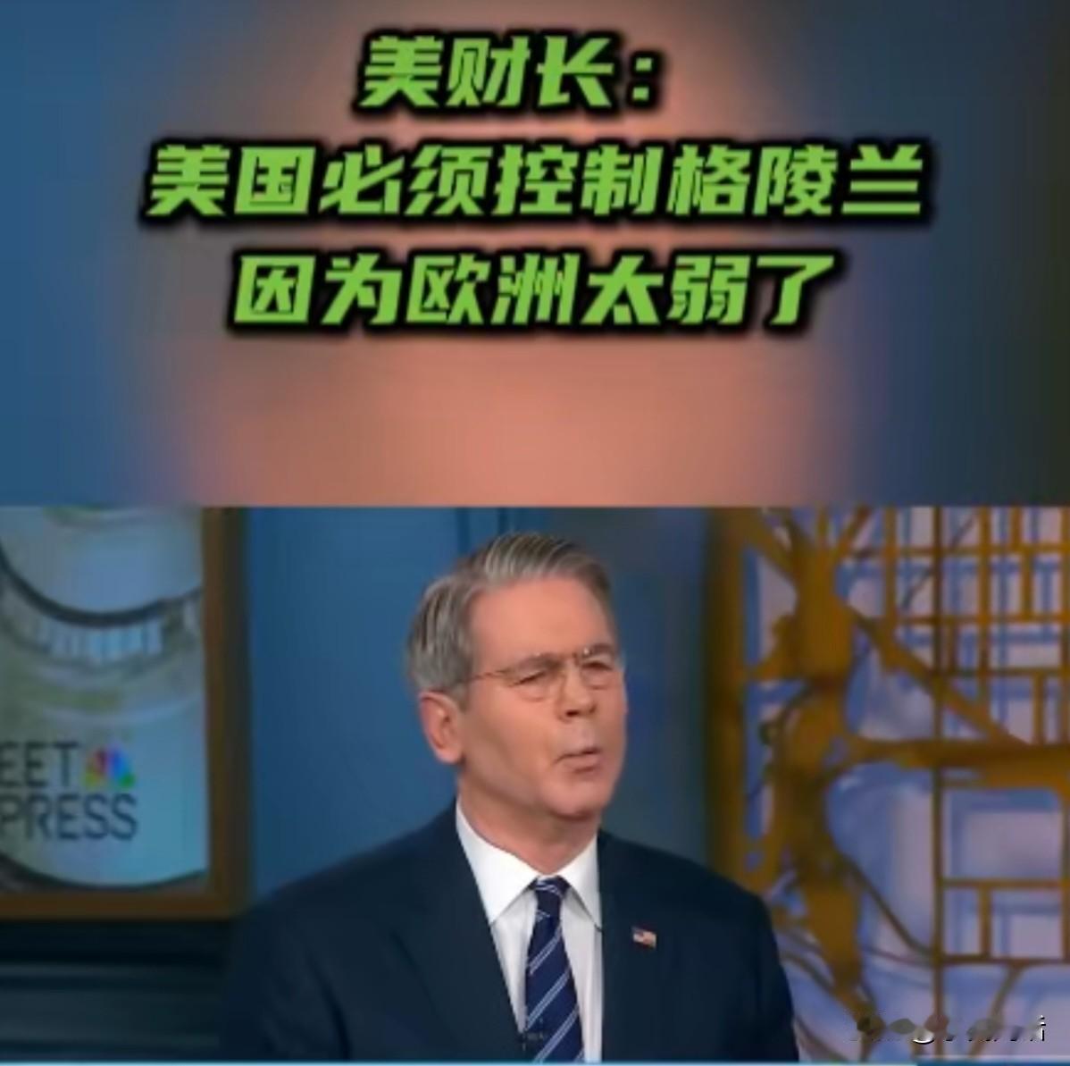 这就是欧洲依赖美帝保护的结果! 据今日俄罗斯( RT)报道,当地时间1月18日,美国财长贝森特表示:美国是世界上最炙手可热、最强大的国家,欧洲对外展示的是软弱,而美国展示的是力量。如果格陵兰遭到来自俄罗斯或其他国家的攻击,我们都会被卷入其中,所以不如现在就通过实力来维护和平,把它变成美国的一部分就不会发生冲突。
