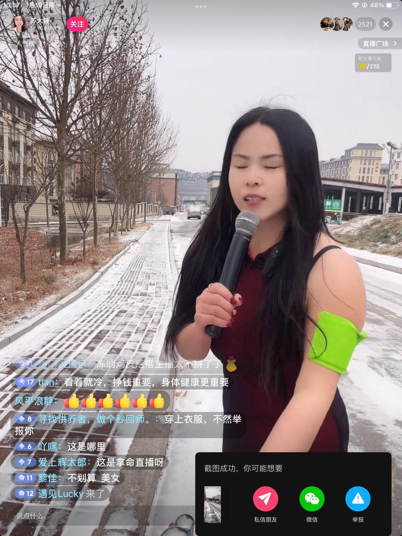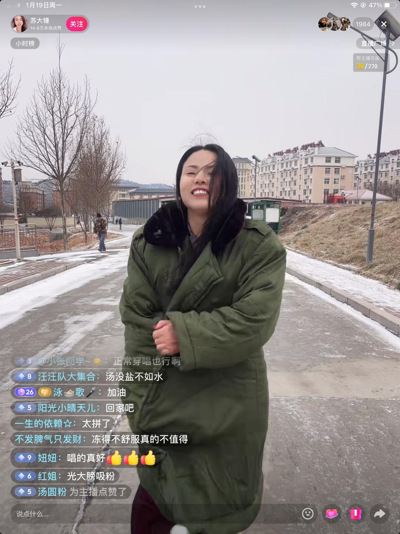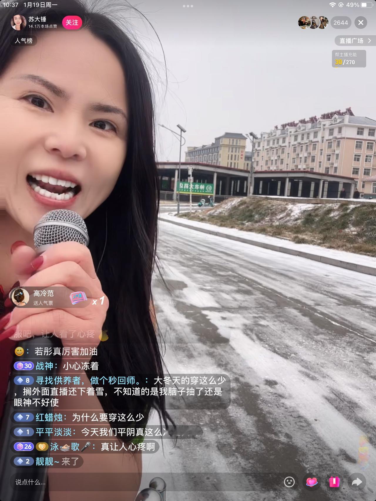 抖音上一个女的直播,冰天雪地里,两千多人看,没有一个刷礼物的。搁以前,我肯定得笑话她。看了五分钟,还有让人给看看雪的,她抓起一把雪,放到镜头展示。那个人也没有刷礼物表示一下感谢。哪怕一毛钱的小礼物都没有。 互联网更多的时候看的是笑话。路过一个大叔,不可置信的眼神儿,瞅了好几眼。也不知他当时在想什么。可能想,她不冷吗?是不是傻? 主播手机没电了,推着回家,聊了会天,她单亲,养一个闺女,五岁。孩子感冒了,在家里等着医生去打点滴。 底下有人问咋不上班。她说,能吃了这个苦,吃不了上班的苦吗?能,一样能。只是孩子没人管了。 人气最高的时候2600,穿上军大衣立马掉到了1900,笑话人的还是占大多数。这世界,挺难活的,活的好就更难了。冻成孙子了,也没个小礼物出现。真挺心酸的。加油吧!孩子妈!