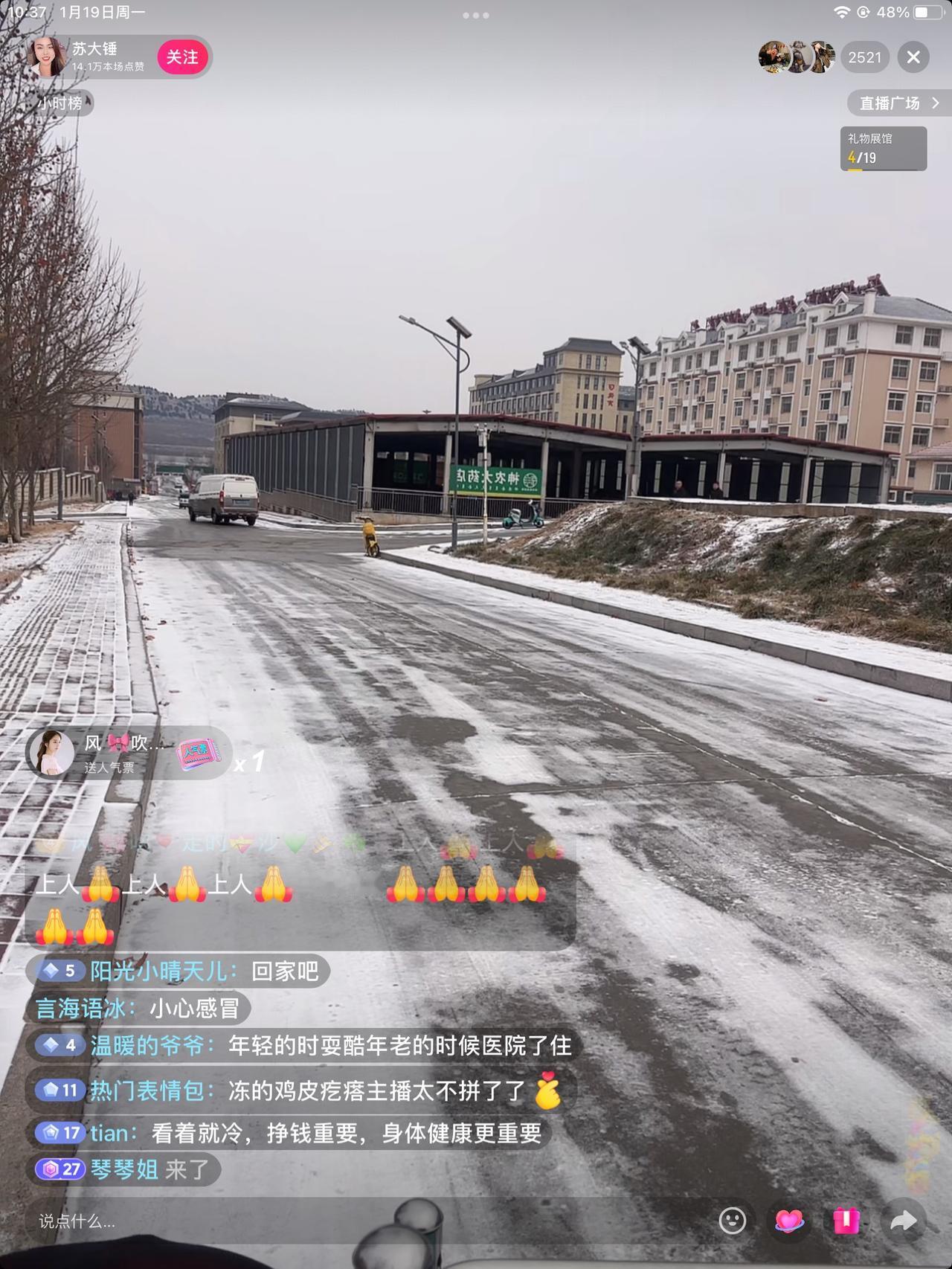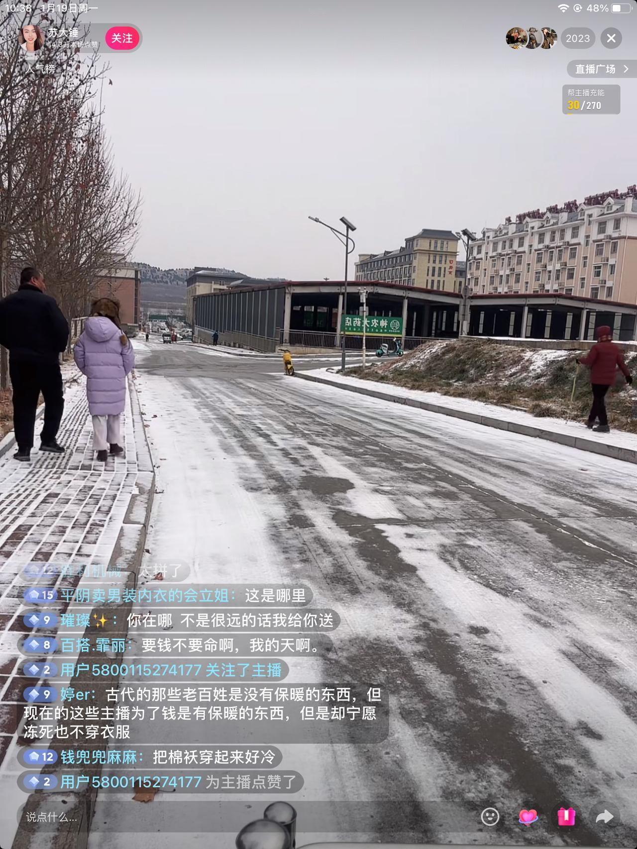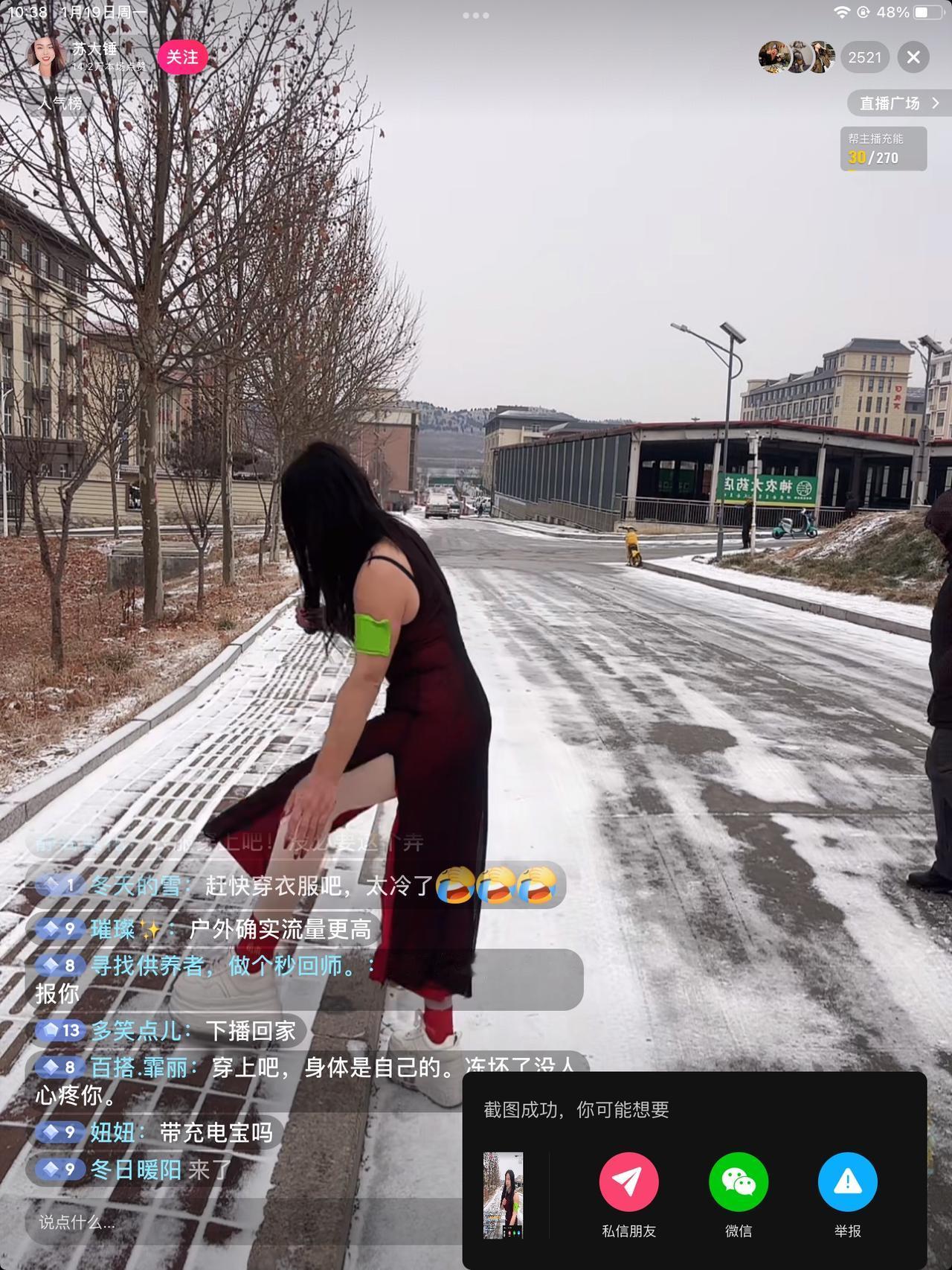 抖音上一个女的直播,冰天雪地里,两千多人看,没有一个刷礼物的。搁以前,我肯定得笑话她。看了五分钟,还有让人给看看雪的,她抓起一把雪,放到镜头展示。那个人也没有刷礼物表示一下感谢。哪怕一毛钱的小礼物都没有。 互联网更多的时候看的是笑话。路过一个大叔,不可置信的眼神儿,瞅了好几眼。也不知他当时在想什么。可能想,她不冷吗?是不是傻? 主播手机没电了,推着回家,聊了会天,她单亲,养一个闺女,五岁。孩子感冒了,在家里等着医生去打点滴。 底下有人问咋不上班。她说,能吃了这个苦,吃不了上班的苦吗?能,一样能。只是孩子没人管了。 人气最高的时候2600,穿上军大衣立马掉到了1900,笑话人的还是占大多数。这世界,挺难活的,活的好就更难了。冻成孙子了,也没个小礼物出现。真挺心酸的。加油吧!孩子妈!