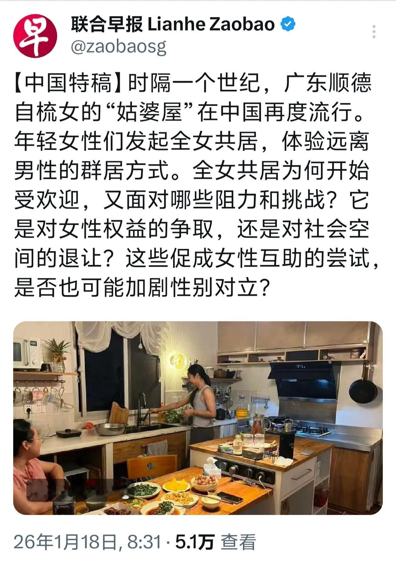 广东佛山的“全女共居”火到了国外! 顺德自梳女的“姑婆屋”,这些年轻女性推行全女共居,体验远离男性的群居方式。也不知道,这是哪里传来的行为艺术,国外女权主义都没这么干。 前几年,有全女书店、全女咖啡屋、全女餐厅,都以失败告终。最搞笑的是那个深圳全女野外徒步营,最后有女生被同伴抛弃在半路,跑到小红书控诉,最后滑稽收场。 几个女人聚在一起,时间长了,内部问题比多事的男女家庭还多。毕竟大学女生宿舍四个人十几个群的事,男生可干不出来。中国女权 非典型女权 佛山合租女生