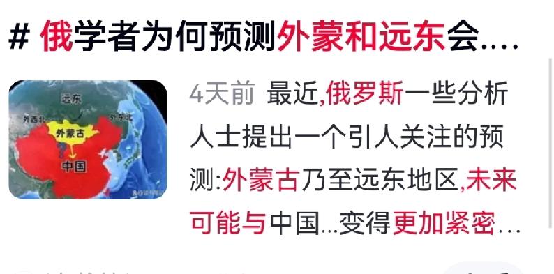 有观点认为,外蒙古及俄罗斯远东未来可能与我国联系更加紧密。从历史看,两地曾与中原联系密切;如今经济合作日益深化。 蒙古国矿产出口超九成流向中国,日用商品大量自华进口,铁路通道亦依赖中方。俄远东地区地广人稀,中俄积极开展农业与能源合作,“西伯利亚力量2号”等项目持续推进。 尽管现有边界受国际法确认,但紧密的经济协作与人文往来仍在自然生长。我国始终坚持和平发展,推动互利共赢。未来区域合作空间广阔,共同发展的故事值得期待。 对此你怎么看?