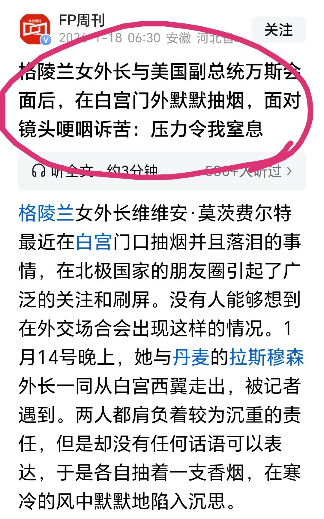 格陵兰岛的外交负责人会见美国副总统后欲哭无泪。 这一画面必将被历史记载,在野蛮世界,人类弱小的一方在丛林法则下是多么的无奈与无助。 这样的场面还有叙利亚驻联合国代表贾法里,还有中华民国的代表白崇禧。 龙女士前夫的祖国在坚守阵地44小时后选择了撤退,她的“小民尊严”在格陵兰岛外交负责人手指间变成了灰烬。 简中的那些V们努力想要拥抱的文明展现出野蛮的本色,而被他们诋毁为野蛮的地方被发现是人类真正的文明。 世界就是这样荒诞 顺便说一句:艾未未转向小粉红了,意不意外?惊不惊喜? 点右上角关注我,我们一起去看这个魔幻的世界