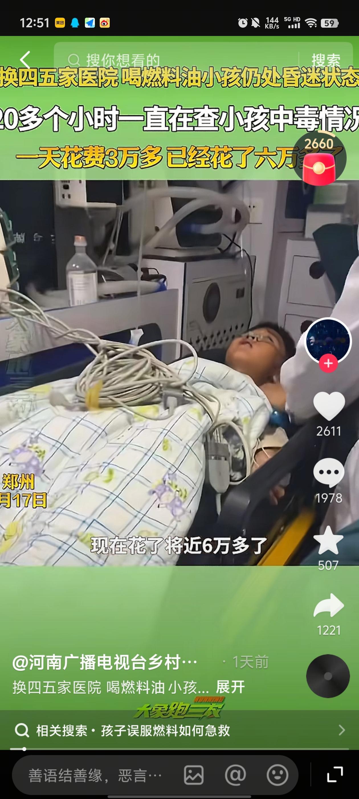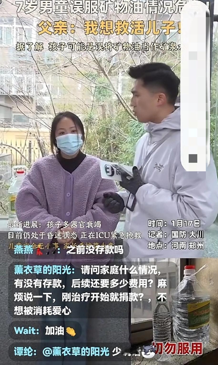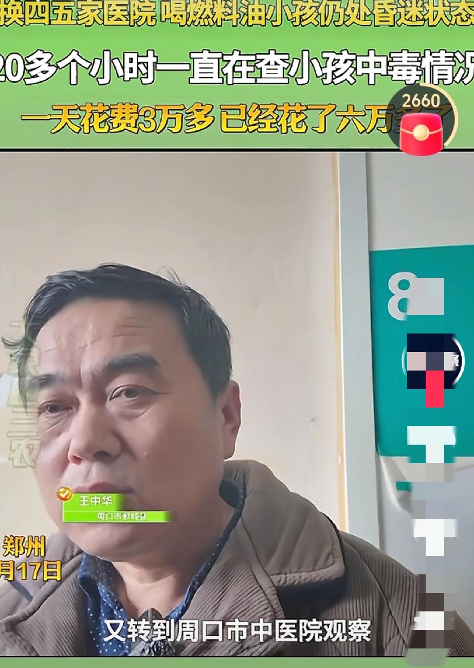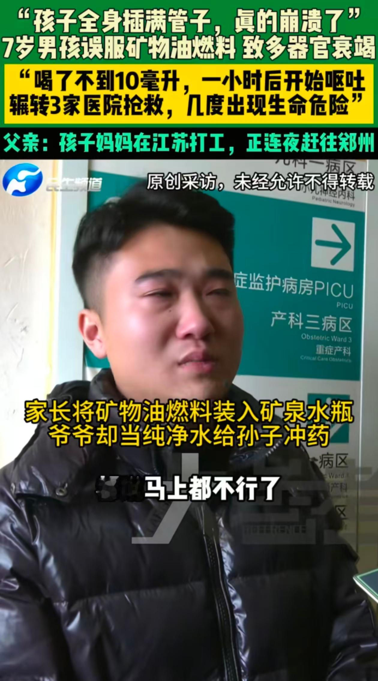 爷爷说,孩子喝了不到10毫升,立马觉得不对,一问孩子父亲,父亲脚都吓软了! 原来轩轩喝的是火锅燃料,是用矿泉水瓶装的,爸爸拿回家没给爷爷说,也没标注,就放在房间角落。 这玩意儿无色无味,爷爷说,家里没矿泉水,自己便把这个水给孩子兑药,孩子喝了没多久,就昏迷了,爷爷立马把孩子送医院。 医院建议爷爷洗胃,爷爷说考虑,不知道是他不懂还是怕孩子受罪,这一观察又耽误一个小时,后来还转了两次院,错过最佳治疗时间。 而妈妈那边还在外地上班,她接到电话后,天塌了!她说自己刚刚出来上班几个月,以前都是自己带孩子,奶奶也在外地上班,所以孩子就给爷爷带。 经过几天抢救,孩子终于醒了,医院说孩子的肾受损,一直在留血。 妈妈哽咽地说她也不怪爷爷,现在最希望孩子快点好起来!