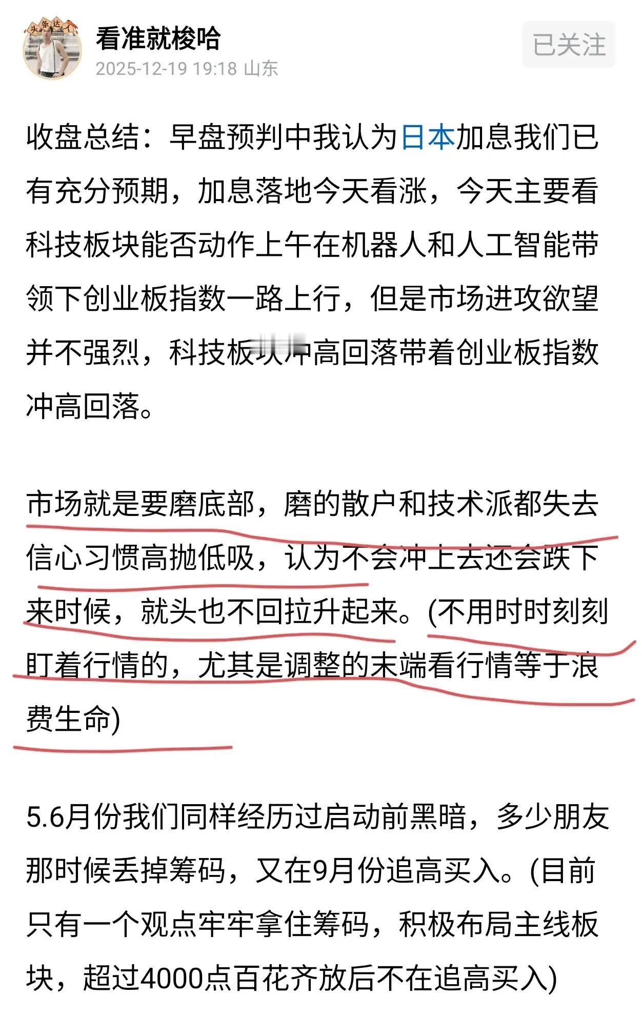 收盘总结:早盘预判中我认为今天上证指数看震荡也主,我们布局主线板块看轮动。今天机器人板块+东方核聚变表现亮眼。这就是我在12月底部区域多次提示底部区域我们要敢于布局不要一路追涨。(行情启动时候只有底部区域筹码足够多,有足够利润垫才能拿住筹码) 只要按12.19和12.22当时文章观点执行,底部区域敢于重仓布局涨起来管住手,超过4000点位百花齐放时间不要再加仓。(那么面对本次调整对我们影响并不大影响最大是追涨航天和AI应用) 目前临近午盘创业板指数再次回落,本周会不会持续回落。本周走势基本就可以确定我们什么仓位过春节(长篇文章已更新) ETF周成交超1.28万亿你怎么看 指数增强是如何选股的