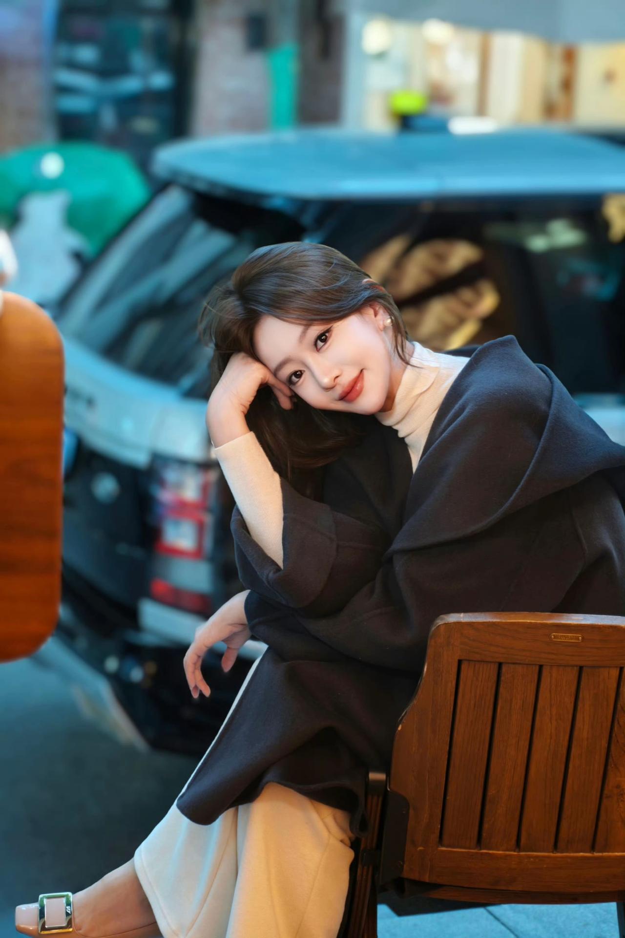 粉衣美人倚长凳,静待佳人入画来。
