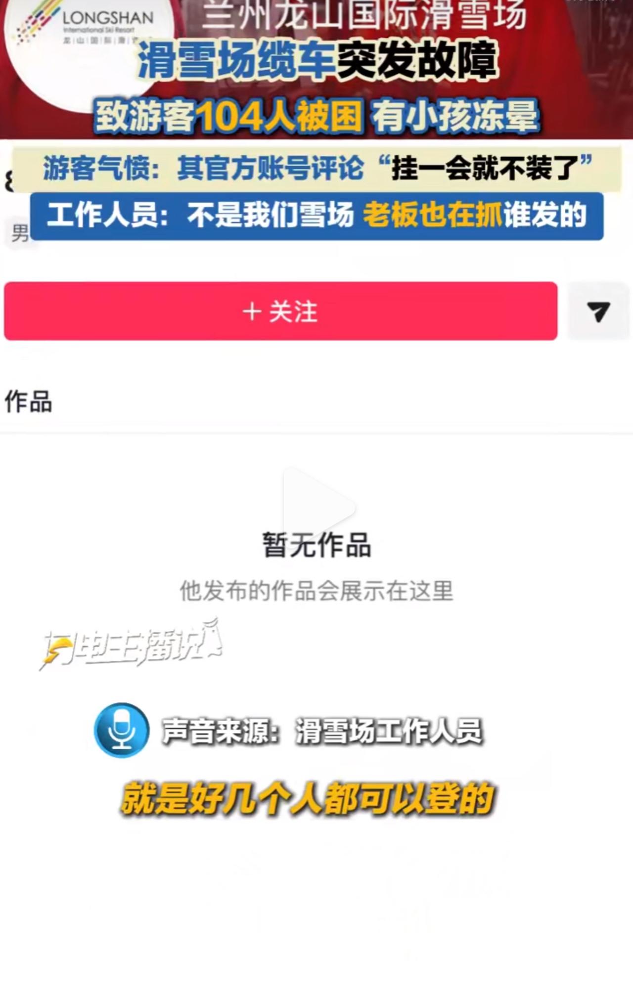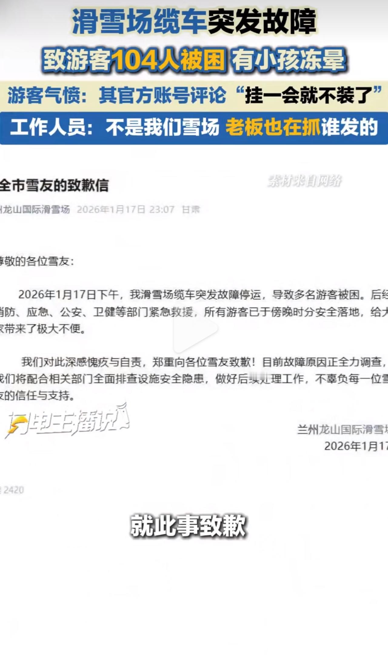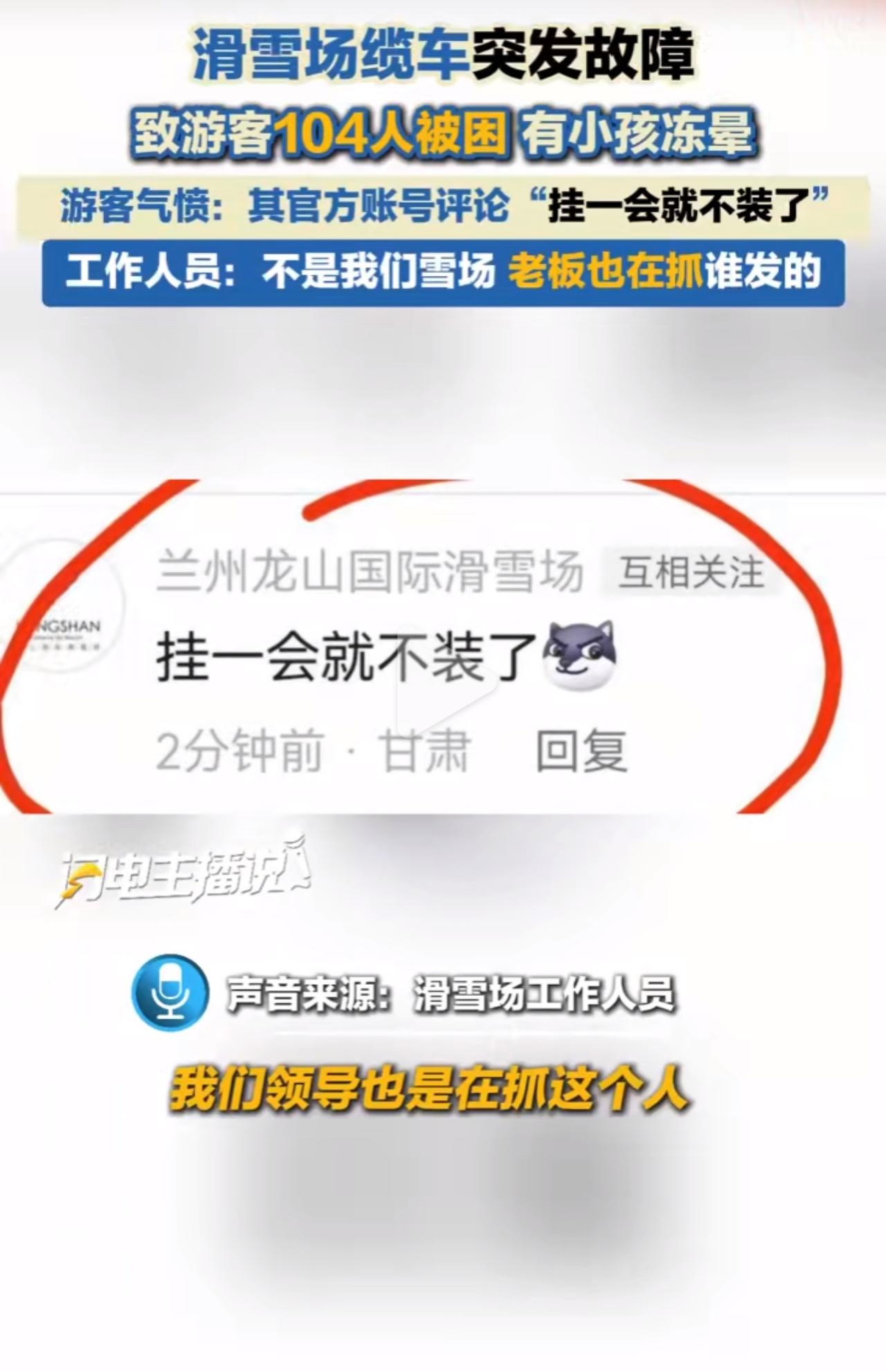 兰州龙山国际滑雪场的缆车突然撂挑子,104名游客全被困在半空。先是内部电机故障停电,刚恢复20分钟,驱动齿轮箱又卡壳了,这双重故障直接把人架在冷风里受罪。那会儿太阳早下山了,气温唰唰往下掉,风刮在脸上跟割肉似的,有小孩直接冻得失去意识,家长在缆车里急得嗷嗷哭,手心全是冷汗。 消防员赶紧赶来救人,让大家丢下雪板减轻重量,架起长梯、拴上绳索,一个一个往下送。折腾了俩小时才把人全救下来,滑雪场事后赔了每人7260块,嘴上说着医疗费全包。可谁能料到,他们官方账号居然在视频底下留言“挂一会就不装了”,这轻飘飘的一句话,简直是往游客心窝子里捅刀! 更气人的是,游客被困那会儿,滑雪场居然还在办什么“肌肉男摄影活动”,敢情游客的安危还比不上一场营销噱头?备用电源压根没启用,救援磨磨蹭蹭慢半拍,日常设备检修更是糊弄事儿! 钱能赔偿损失,可冻出来的病根、吓出来的心理阴影咋算?安全从来不是嘴上说说的空话,滑雪场要是把赚钱的心思多分点在设备维护和应急管理上,何至于闹出这种糟心事!景点缆车事故 兰州龙山滑雪 缆车