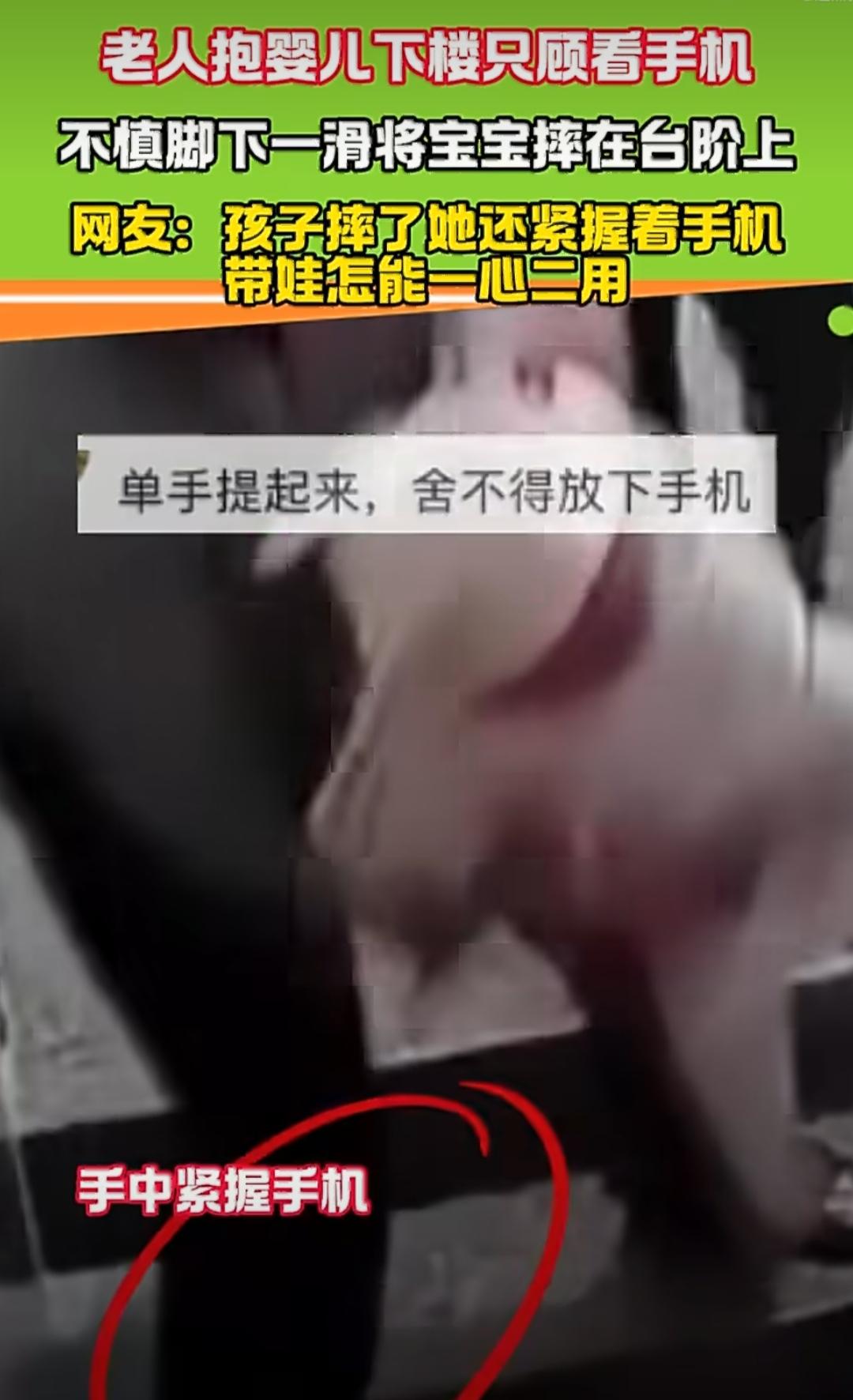 最近广东有个监控视频在网上传得挺火,看完真让人捏一把汗,也给不少带娃的家长和老人提了个大醒。这段监控是楼梯间里拍的,画面里一位老人怀里抱着个小孩,还用腰凳把孩子固定着,正一步步往下走。可让人揪心的是,老人的注意力完全没在脚下和孩子身上,一只手抱着孩子,另一只手紧紧攥着手机,眼睛死死盯着屏幕,看样子是在刷视频或者看消息,走路的时候脚步都没怎么留意台阶。 就在下到一半的时候,可能是因为分心没看清路,也可能是脚下不小心打滑,老人身体突然一个踉跄,怀里的孩子瞬间从腰凳上滑了出去,重重地摔在了坚硬的楼梯台阶上。那一下看着就特别重,孩子肯定疼坏了,换谁看了都得心疼。可接下来的一幕更让人无语,老人下意识地用一只手把孩子从地上捞了起来,另一只手居然还没松开手机,依旧紧紧攥着,眼睛甚至还没完全从屏幕上移开,完全没顾上先仔细看看孩子摔得怎么样,有没有受伤。 这段视频是当地一位博主发出来的,很快就引发了网友的热议,大家都在说带娃怎么能这么分心。有网友说,楼梯间本来就光线不好,台阶又陡,抱着孩子走路就该全神贯注,怎么还能一心二用玩手机呢?还有人吐槽,看孩子是天大的事,手机什么时候不能玩,非要在这么危险的场景下刷,万一孩子摔出个好歹,后悔都来不及。也有网友担心孩子的情况,这么重重一摔,尤其是头部如果撞到台阶,很可能会有严重后果。 不过让人遗憾的是,后来大家再想找原视频了解更多情况时,发现发布视频的账号已经找不到了,孩子到底摔得严不严重、有没有去医院检查、身体状况怎么样,这些信息都没有后续消息,只能希望孩子没事,只是受了点皮外伤。 其实类似的事情之前也发生过不少,有的家长带孩子在公园玩,低头看手机的功夫,孩子就跑到马路边了;有的老人带娃逛商场,光顾着看促销信息,孩子差点被人流冲散。带娃本来就是个需要时刻绷紧神经的活儿,尤其是面对楼梯、马路、水边这些危险场景,稍微一分心就可能发生意外。老人年纪大了,反应本来就慢,再加上手机的干扰,注意力被分散后,应对突发情况的能力就更差了。 不管是家长还是家里的老人,带娃的时候真得把安全放在第一位,手机能不玩就不玩,就算有紧急消息要回复,也得找个安全的地方,把孩子安置好再处理。毕竟孩子的安全容不得半点马虎,一次小小的分心,都可能造成无法挽回的后果,这个教训真的太深刻了。【带娃不能一心二用!