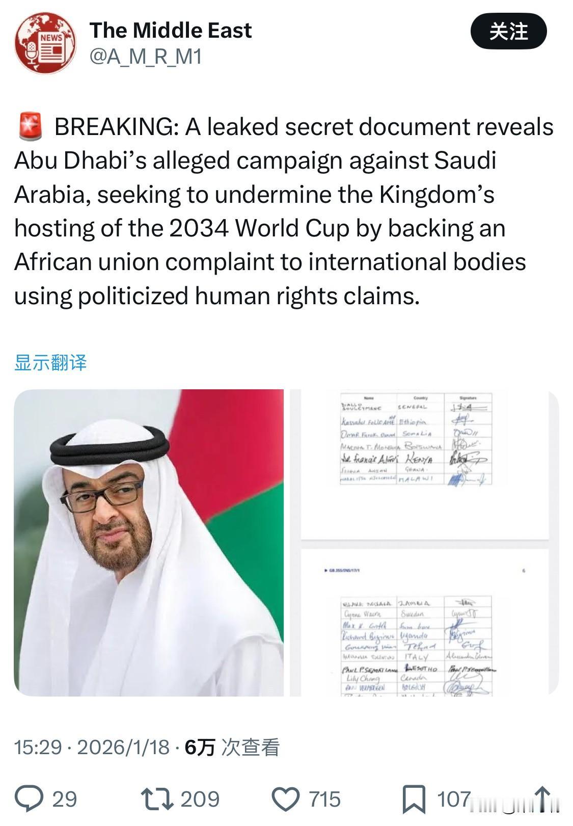 突发新闻:一份泄露的秘密文件揭露了阿布扎比涉嫌针对沙特阿拉伯的行动,试图通过支持非洲联盟向国际机构提出的申诉,利用政治化的人权主张,破坏沙特阿拉伯举办 2034 年世界杯。