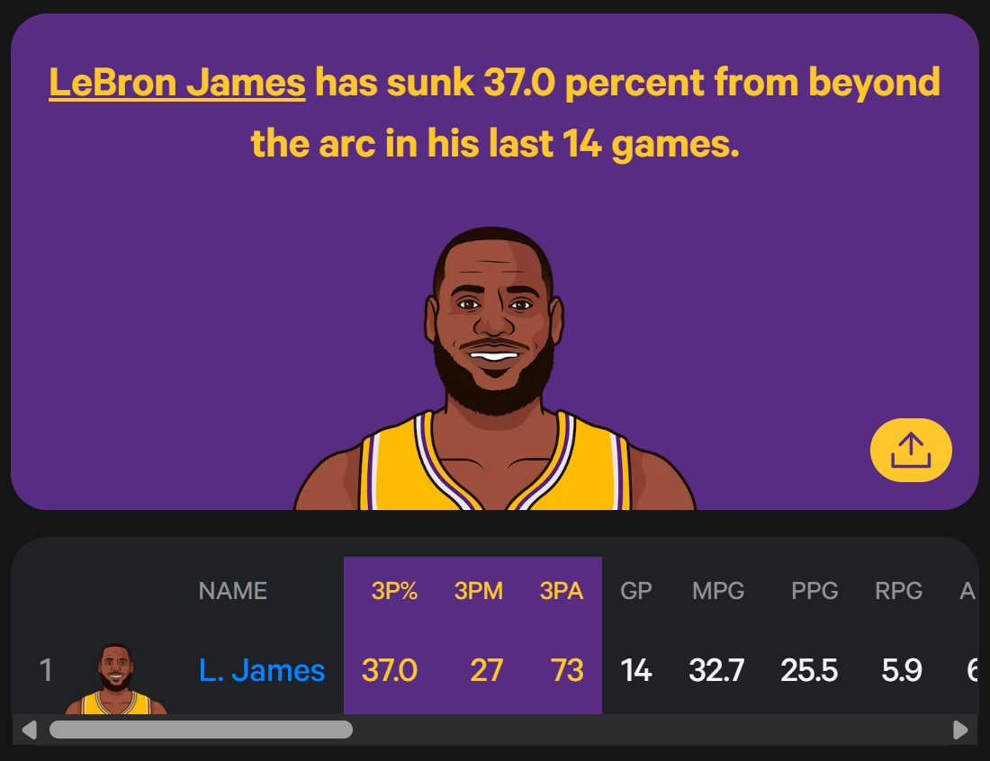 詹姆斯最近14场比赛的三分命中率已经回升到了37%。湖人
