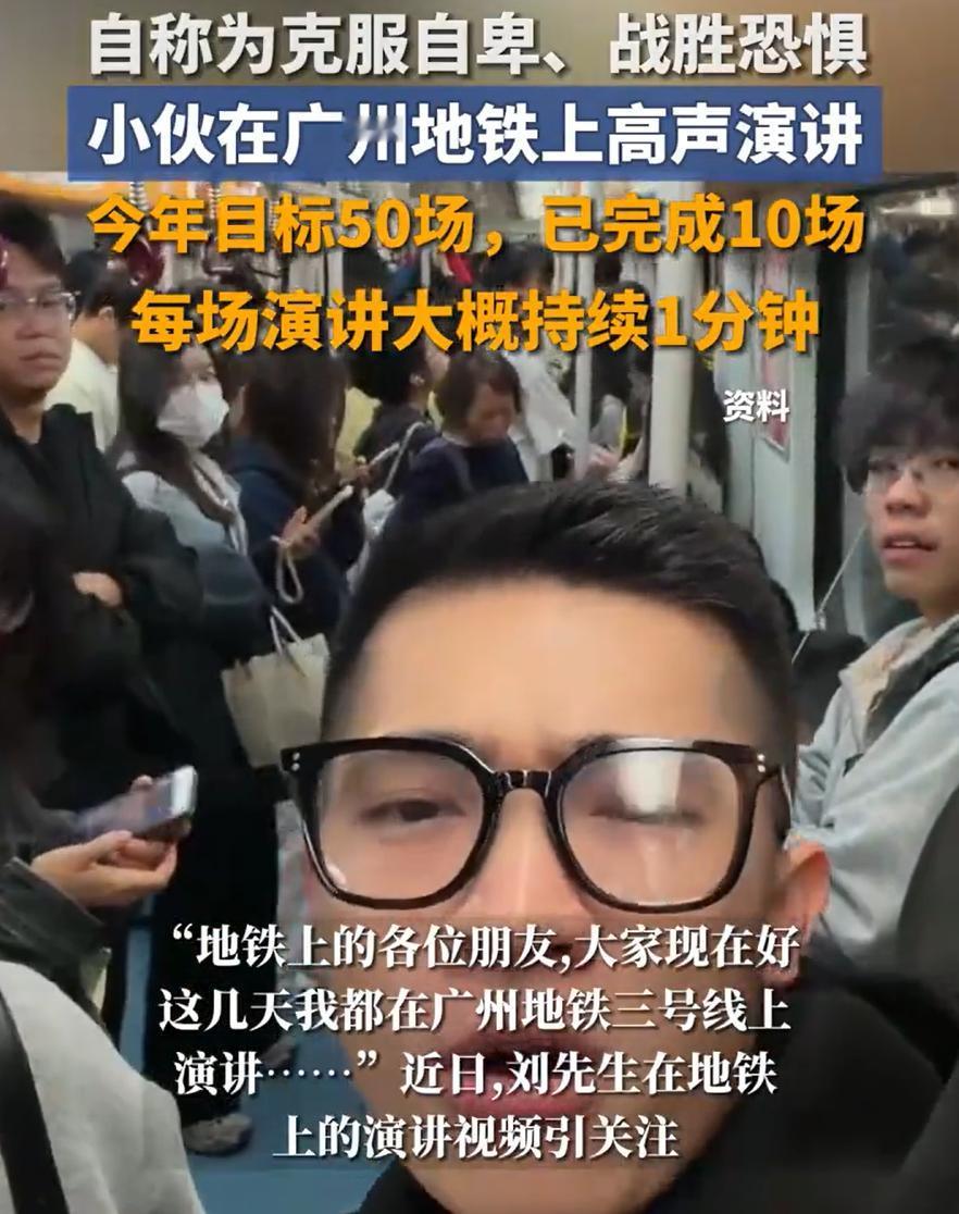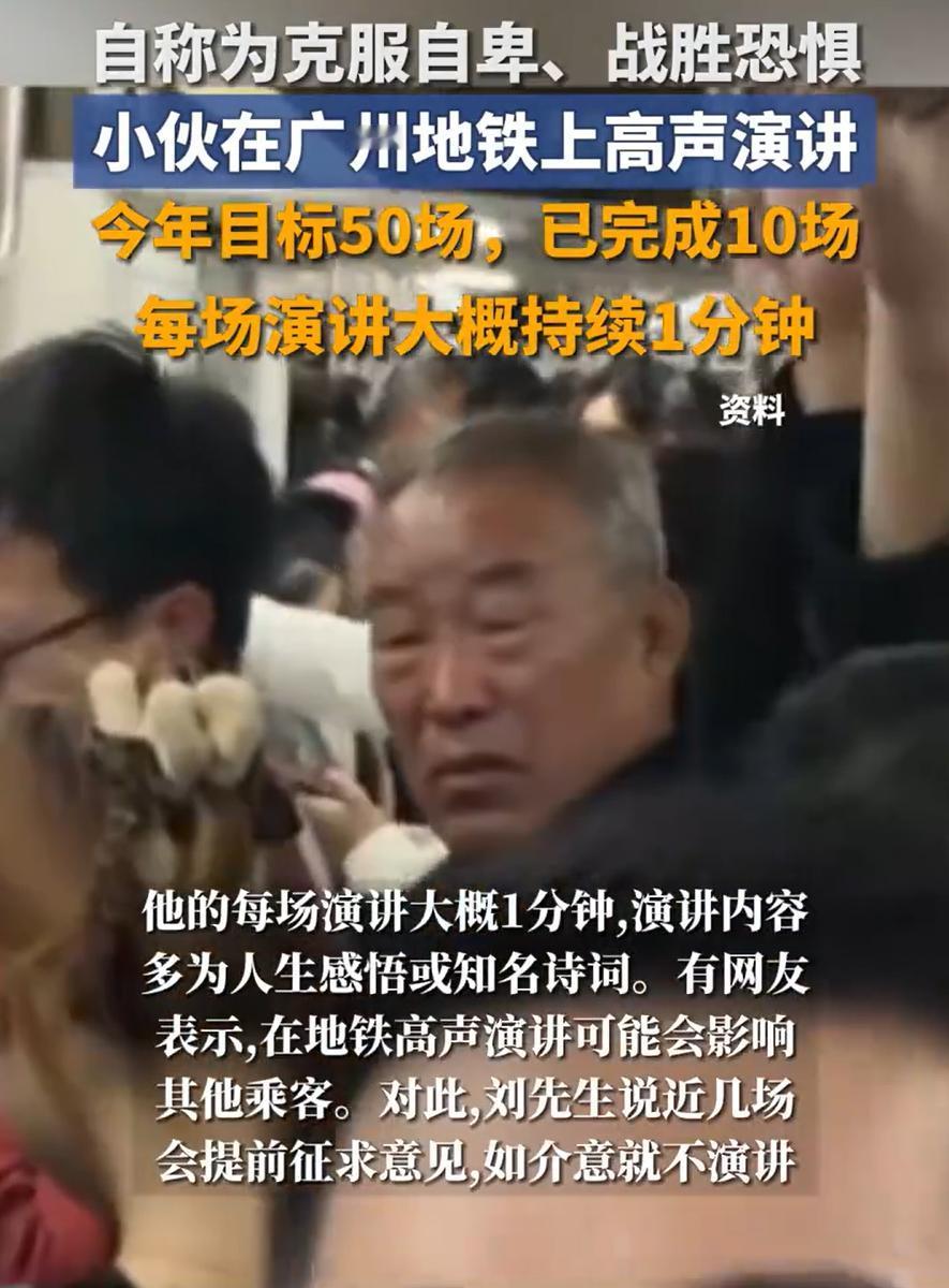 吵翻天!广东广州,一位三十岁的男子自称胆小、自卑,为了能够克服恐惧,专门跑到地铁车厢中进行演讲,把他给自己定下目标,要在今年完成五十场地铁演讲,目前已经进行了十场,结果却引起了不小的争议 刘先生说,这个念头源于元旦那天定下的年度计划。他想改变自己,觉得必须走到人群中去,面对恐惧。选择地铁三号线,是因为那是他每日通勤的路线,相对熟悉。每场演讲大约一分钟,内容多是分享一些人生体会,或者朗诵一段经典的诗词 而从他发布的视频来看,车厢几乎都是满员的状态,而他就站在中间大声演讲 这件事传到网上,看法分成了两派。有人觉得佩服,留言说如果自己在现场,一定会为他鼓掌。他们认为这种直面弱点的勇气,在当下很难得 另一部分声音则提出了质疑:地铁是公共交通工具,车厢属于封闭空间,高声演讲会不会打扰到其他乘客?毕竟有人可能想休息,有人可能在处理工作,突然的演讲会不会成为一种干扰?还有人提到,如果拍摄时镜头扫到周围乘客,也可能涉及他人肖像权的问题 这种做法是否合适,确实值得讨论。从法律角度看,刘先生虽然有改变自己的良好初衷,但这样的方式显然忽视了公共场合的规范。地铁是人们的日常通勤场所,不是专门的演讲场地。如果每个人都按自己的意愿在地铁里做公开演讲,那么其他乘客的权益又该如何保障呢? 而且有一个细节,我觉得是争议的一大原因,就是刘先生的视频中,并没有对其他乘客值得一提的是,他发布的视频,并没有对车厢中其他乘客进行打码和处理 地铁车厢虽然是公共场所,但这并不意味着身处其中的每个人都自动、无偿地许可自己的肖像被记录,并出现在他人的社交平台上,用于实现记录者个人的“突破挑战”或“成长记录”