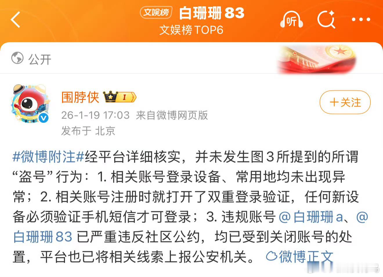 微博说白珊珊没被盗号且微博报给公安机关了