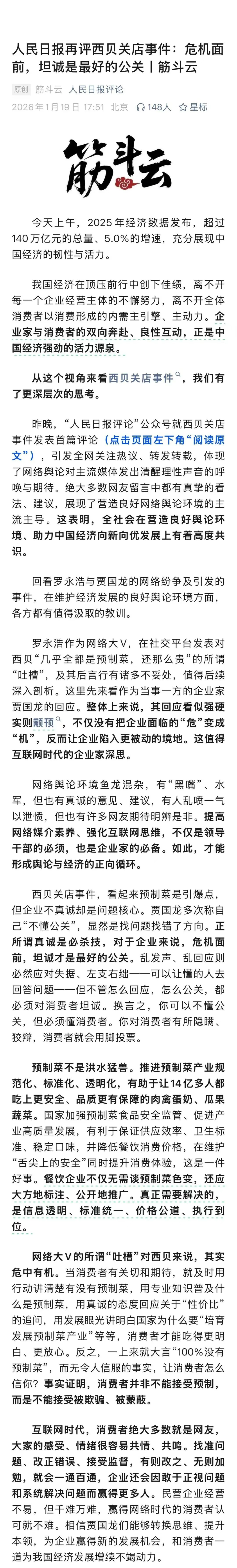 人民日报再评西贝关店事件:危机面前,坦诚是最好的公关。