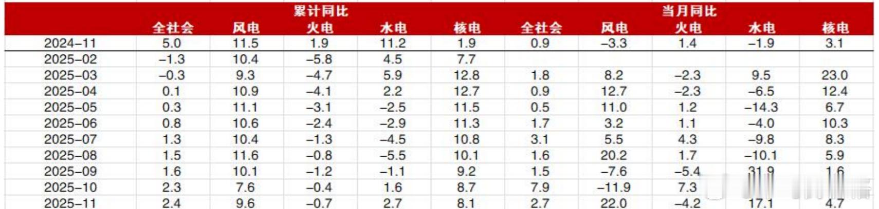 从2025年前11个月数据看,风电、水电发电量累计同比扩大,风电发电量累计同比增速接近10%