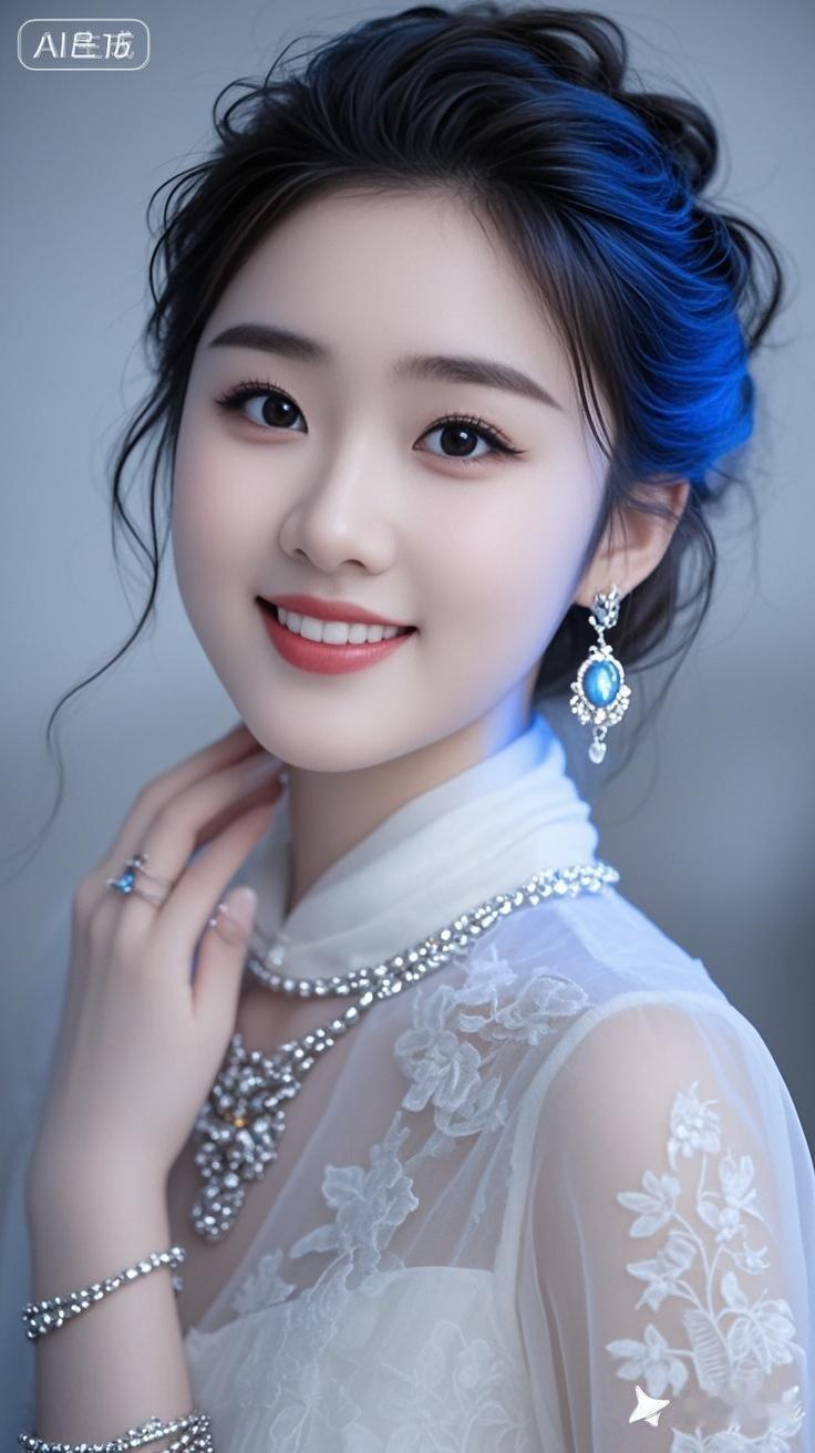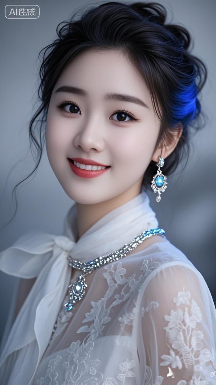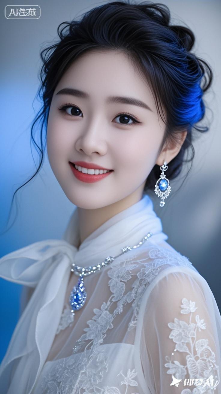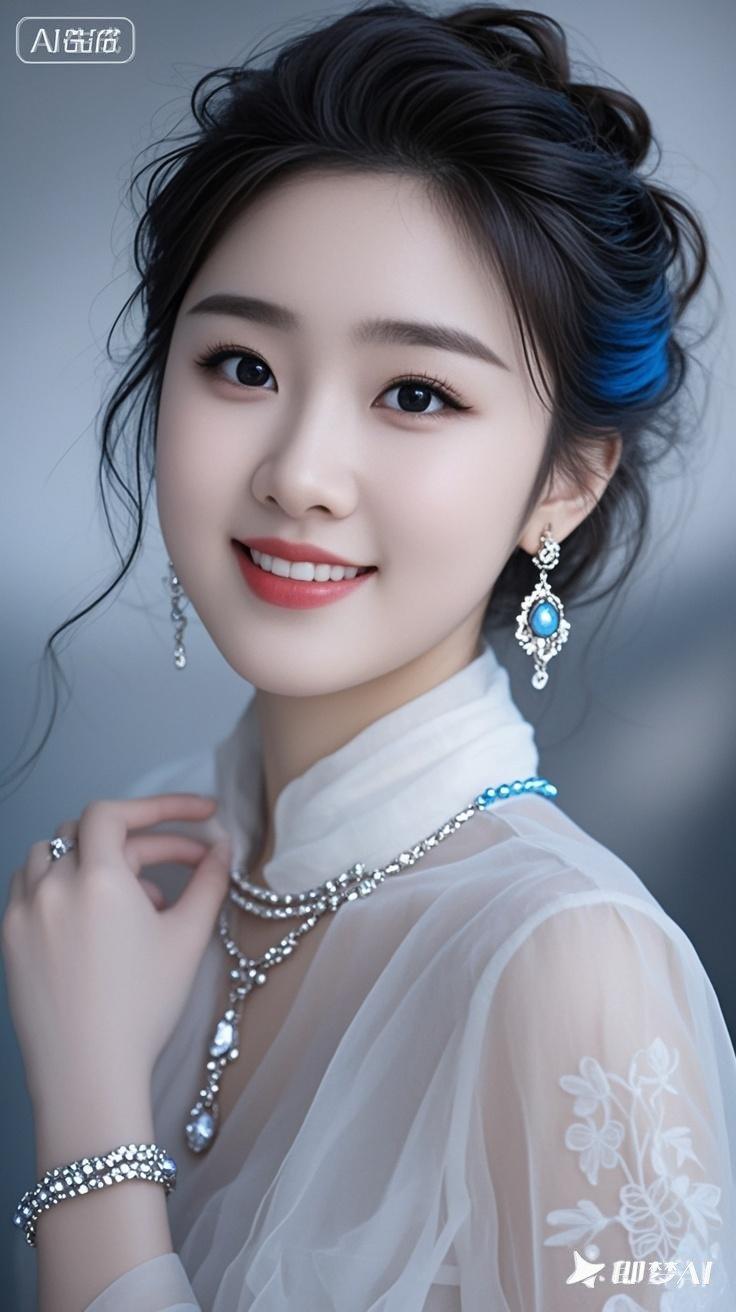 一位年轻漂亮的美女,身穿时尚棉麻雪纺衫,戴着耳环、项链和精质手链,有着精致妆容和蓬松盘发,温和微笑