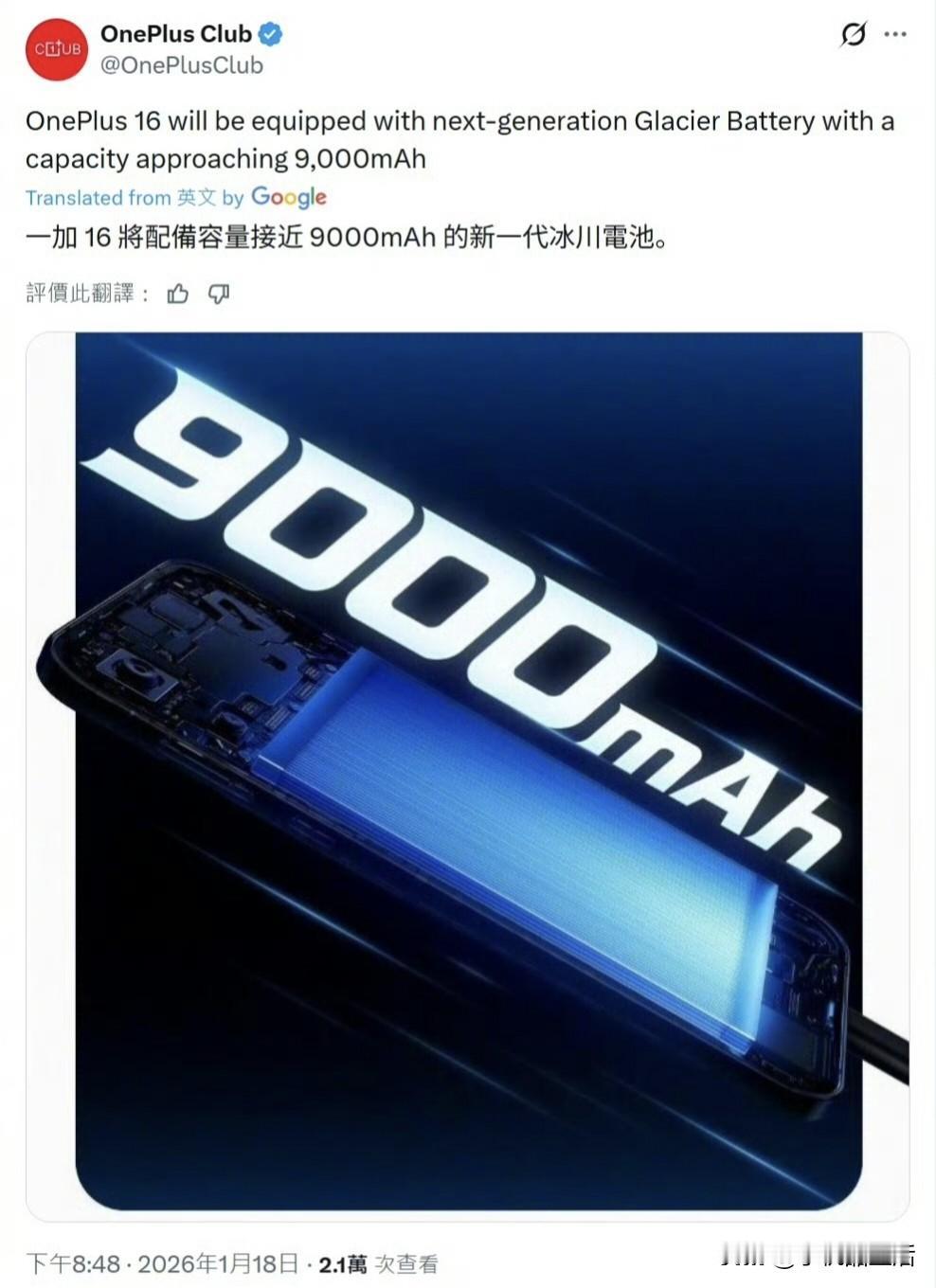 近日,据消息源“OnePlus Club”透露,一加16手机将配备容量接近9000mAh的新一代冰川电池,比一加15大1700mAh。 作为参考,一加15手机配备7300mAh的硅负极电池,支持120W有线快充、50W无线快充。