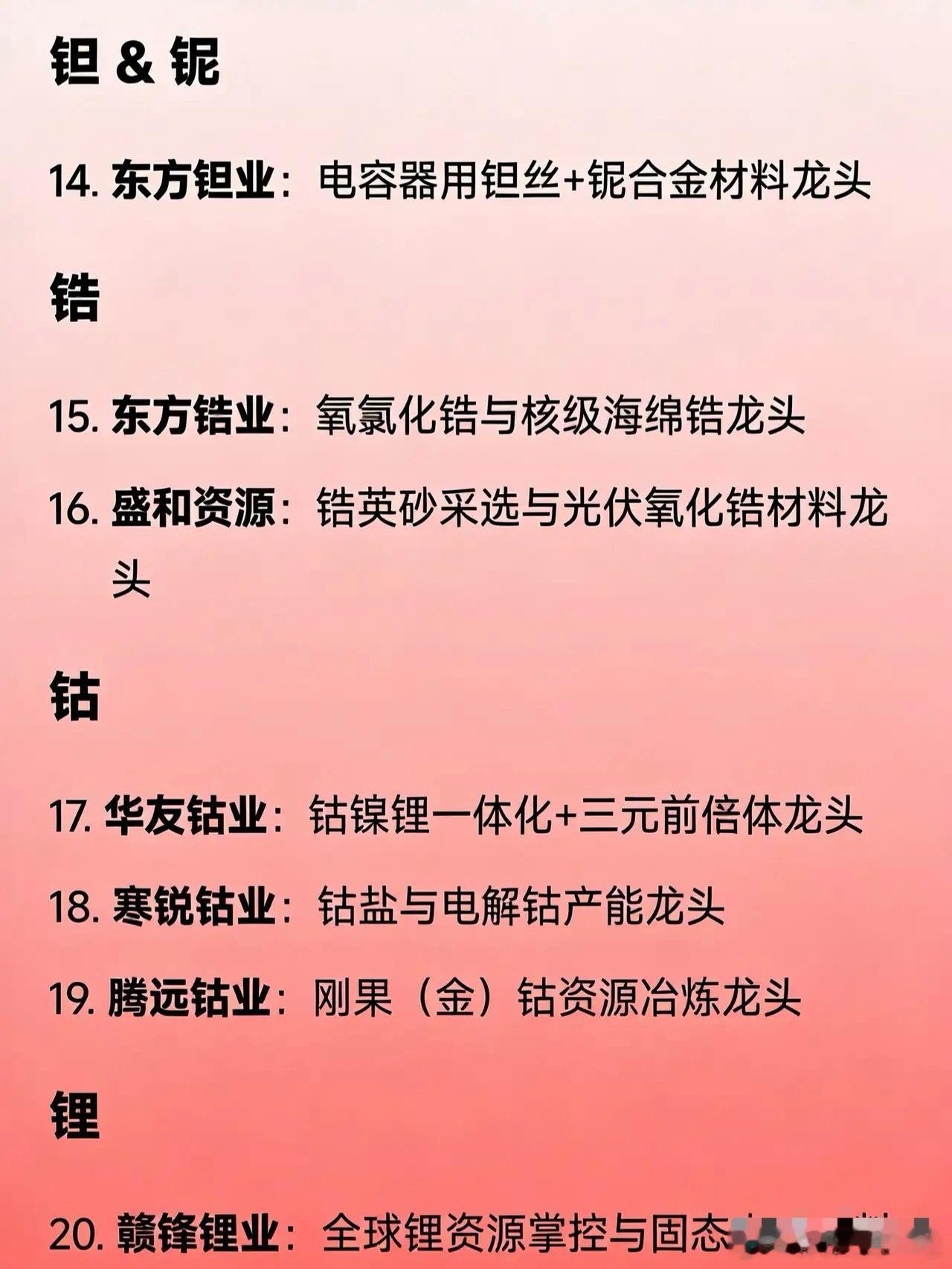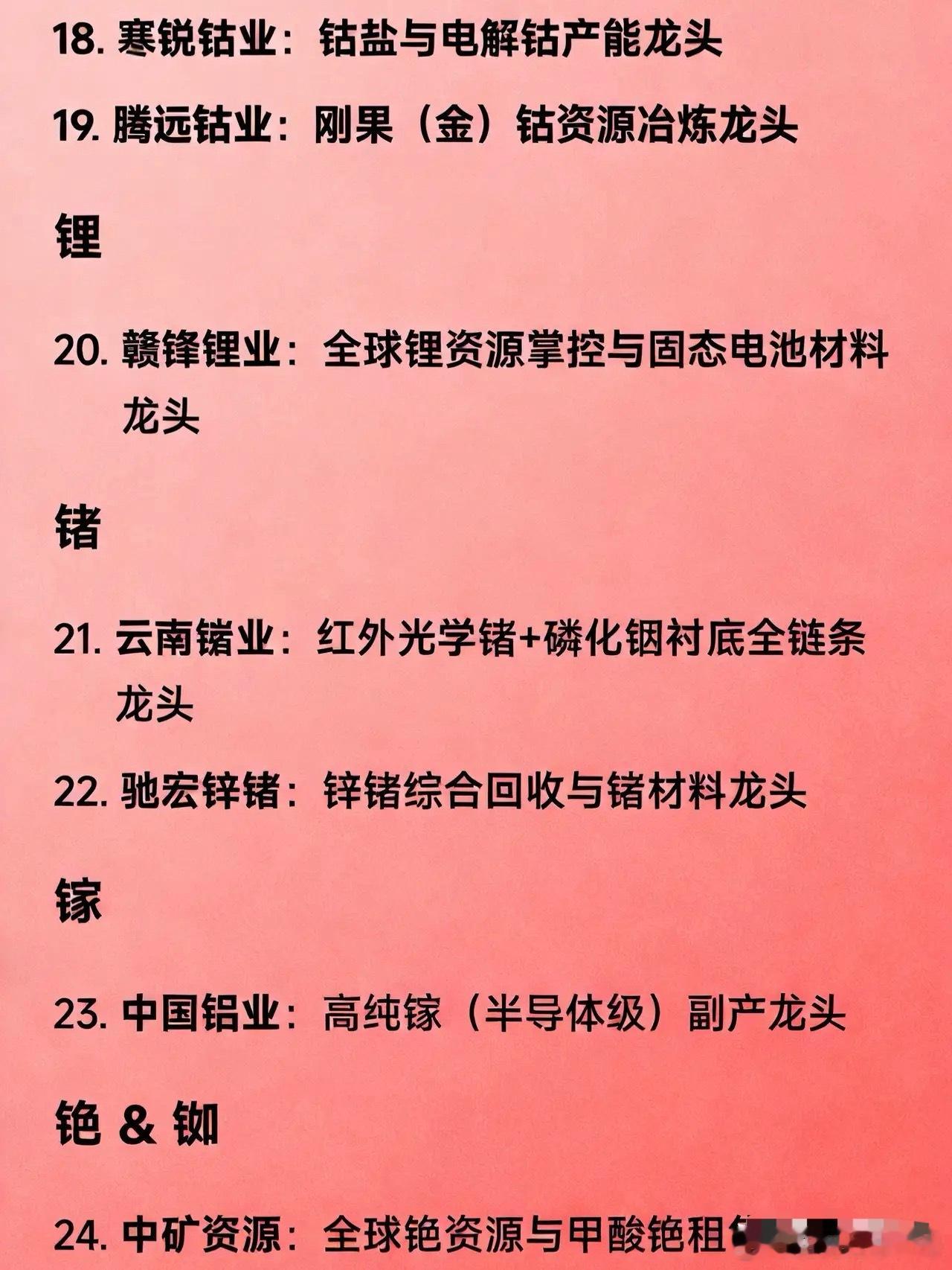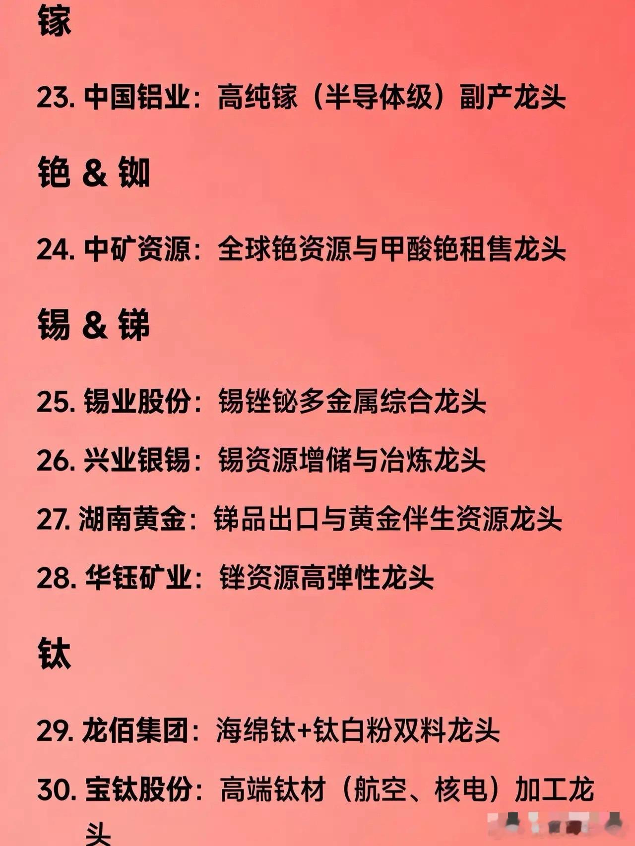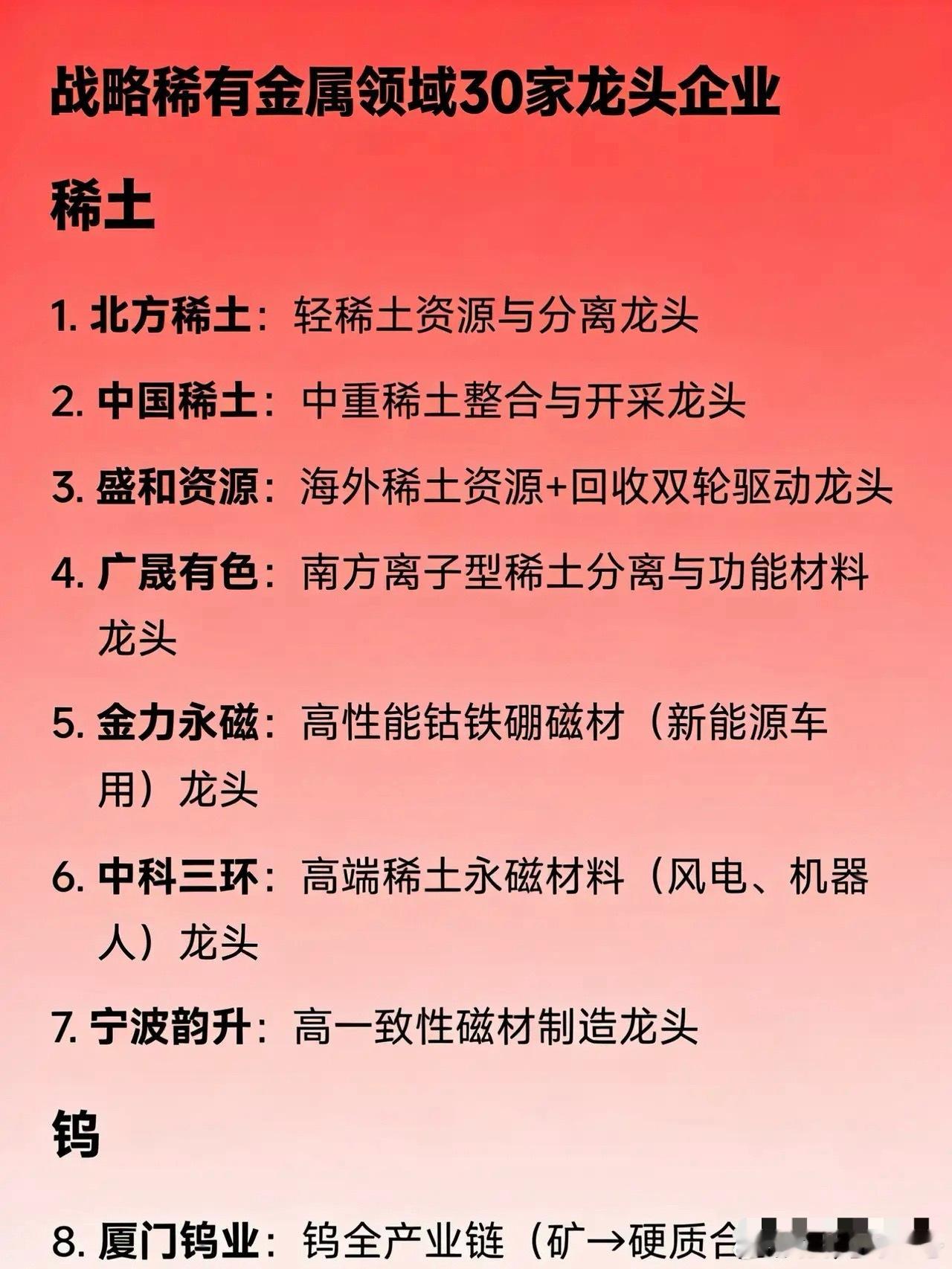 🎯 战略稀有金属30家龙头企业全梳理🔹 稀土(7家)企业名称 核心定位 北方稀土 轻稀土资源与分离龙头 中国稀土 中重稀土整合与开采龙头 盛和资源 海外稀土资源+回收双轮驱动龙头 广晟有色 南方离子型稀土分离与功能材料龙头 金力永磁 高性能钕铁硼磁材(新能源车用)龙头 中科三环 高端稀土永磁材料(风电、机器人)龙头 宁波韵升 高一致性磁材制造龙头 🔹 钨(4家)企业名称 核心定位 厦门钨业 钨全产业链(矿→硬质合金→刀具)龙头 中钨高新 数控刀片与硬质合金制品龙头 章源钨业 光伏钨丝+超细硬质合金龙头 翔鹭钨业 钨粉与碳化钨粉产能龙头 🔹 钼(2家)企业名称 核心定位 金钼股份 钼精矿与深加工材料(钼板/钼丝)龙头 洛阳钼业 全球钼资源多元化布局龙头 🔹 钽 & 铌(1家)企业名称 核心定位 东方钽业 电容器用钽丝+铌合金材料龙头 🔹 锆(2家)企业名称 核心定位 东方锆业 氧氯化锆与核级海绵锆龙头 盛和资源 锆英砂采选与光伏氧化锆材料龙头 🔹 钴(3家)企业名称 核心定位 华友钴业 钴镍锂一体化+三元前驱体龙头 寒锐钴业 钴盐与电解钴产能龙头 腾远钴业 刚果(金)钴资源冶炼龙头 🔹 锂(1家)企业名称 核心定位 赣锋锂业 全球锂资源掌控与固态电池材料龙头 🔹 锗(2家)企业名称 核心定位 云南锗业 红外光学锗+磷化铟衬底全链条龙头 驰宏锌锗 锌锗综合回收与锗材料龙头 🔹 镓(1家)企业名称 核心定位 中国铝业 高纯镓(半导体级)副产龙头 🔹 铯 & 铷(1家)企业名称 核心定位 中矿资源 全球铯资源与甲酸铯租售龙头 🔹 锡 & 锑(4家)企业名称 核心定位 锡业股份 锡锑铋多金属综合龙头 兴业银锡 锡资源增储与冶炼龙头 湖南黄金 锑品出口与黄金伴生资源龙头 华钰矿业 锑资源高弹性龙头 🔹 钛(2家)企业名称 核心定位 龙佰集团 海绵钛+钛白粉双料龙头 宝钛股份 高端钛材(航空、核电)加工龙头