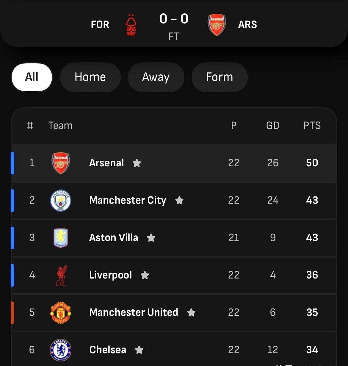阿森纳7分领跑却两连哑火 枪手50分,曼城43分,维拉43分,利物浦也掉链子。周末前四集体刹车,榜首却更稳了。 森林门将塞尔斯连扑萨卡、哈弗茨,手球没判,塔帅赛后只叹气。0比0,对球迷像吞苍蝇,对积分榜却是护身符。 曼城0比2输曼联,瓜迪奥拉第70分钟才换人,哈兰德整场隐身。蓝月球迷在社媒刷屏:冬窗不买人,四月就掉队。 维拉主场11连胜被埃弗顿终结,巴里一脚低射,托雷斯和马丁内斯互相埋怨。埃梅里赛后直接说争四,不提争冠,更衣室心气散了。 我算了下,枪手后面16轮再拿32分就能冲线。平均两场拿4分,听起来松,可英超魔鬼赛程专挑三月。塔子得先解决进球荒,冬窗补个能背身的中锋,比练定位球更管用。 别小看这7分,2012年曼联四月领先8分都能翻船。冠军不是算出来的,是一场场熬出来的。