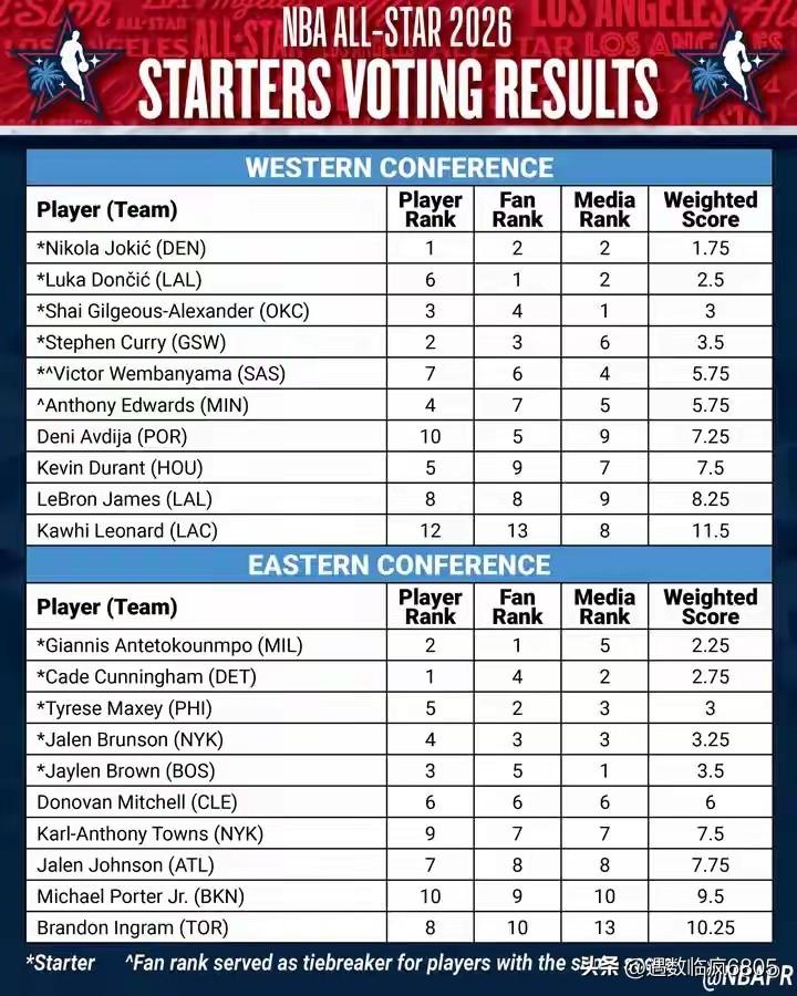 东契奇成为新“票王”,詹姆斯落选NBA首发,记录中断。 NBA官方刚公布了2026年全明星赛的首发阵容。西部首发是亚历山大、约基奇、东契奇、文班亚马和库里,东部首发是字母哥、坎宁安、布伦森、马克西和杰伦-布朗。 詹姆斯、杜兰特、哈登、伦纳德均未能入选首发,估计替补还是能捞一个名额,从这次全明星名单可以看出,“詹杜时代”结束了。