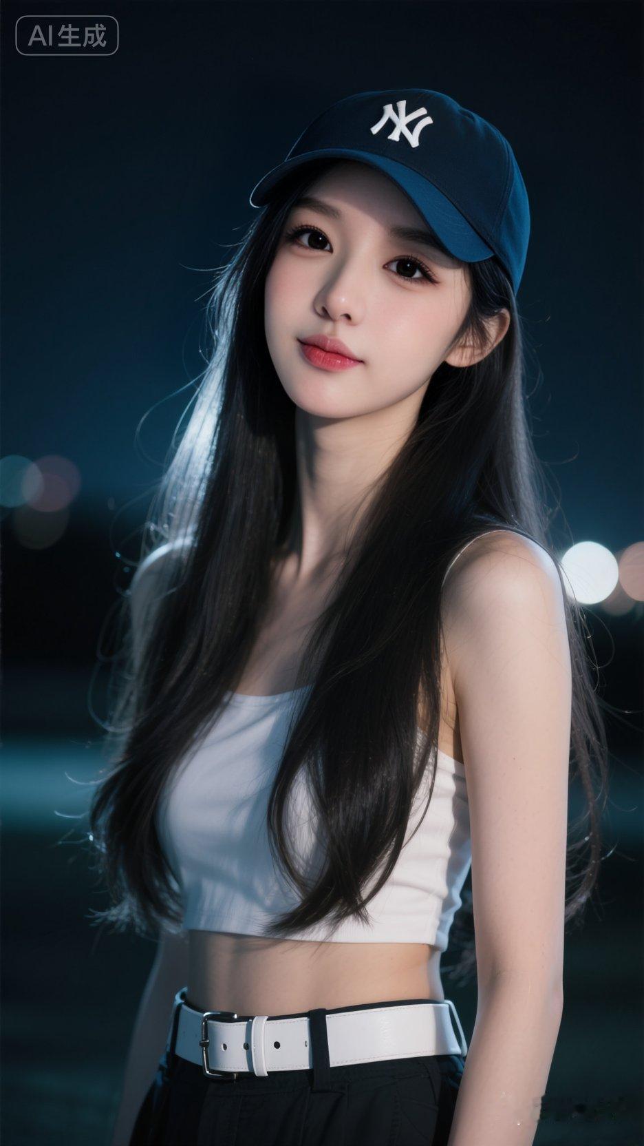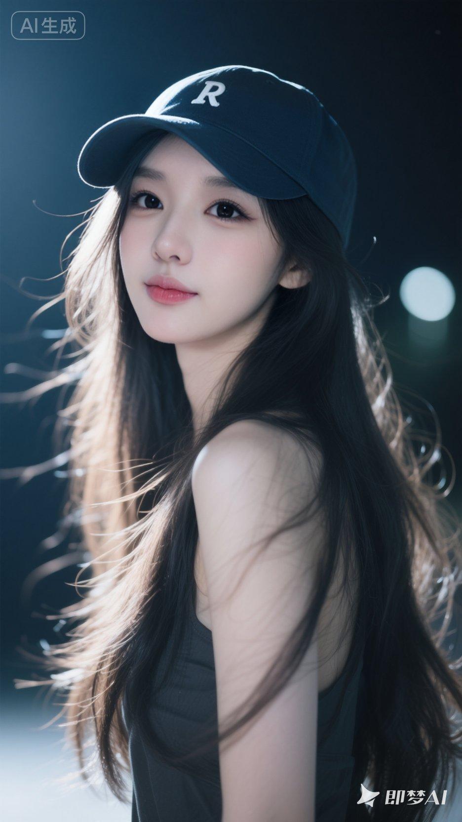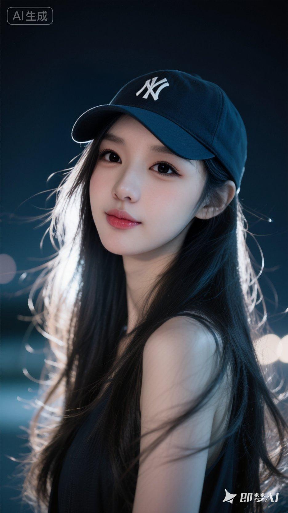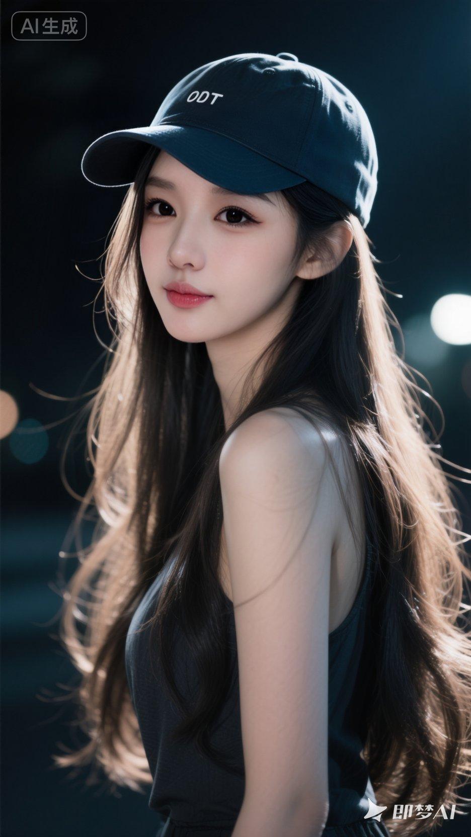 在夜晚的场景中,一头飘逸的长发,头戴棒球帽,半遮着那张漂亮的脸,有着微醺的模样,表情细腻且自然,冷白皮,脸上带着一抹淡淡的微笑,穿着OOTD服饰,暗色调的背景烘托出静谧神秘的氛围,柔和的发丝光轻柔地映照在头发上