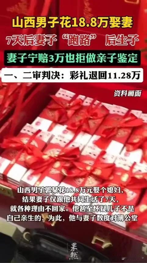 山西男子花18.8万娶妻,7天后妻子跑路!她宁赔3万也拒做亲子鉴定 这女的是彻底坐不住了!眼看男方死咬着亲子鉴定不放松,她竟然主动掏出3万块封口费,死活不让做检测。表面上说是“怕孩子折腾”,实际上这不就是心里有鬼吗?不过,这事背后可没那么简单,婚前3天她就挖好了坑。 说穿了,这哪里是奔着好好过日子去的,明摆着就是一场步步为营的“彩礼收割”陷阱。山西的郭先生怕是做梦都未曾料到,自己豪掷18.8万彩礼娶进门的妻子,婚后才共同生活了7天就甩手走人。更令人咋舌的是,就在大喜之日的前3天,女方杜某突然抛出了一个“霸王条款”:婚后工资必须全额上交,至于钱款去向一概不准过问,问了就是不信任! 彼时的郭先生早已被恋爱的甜蜜冲昏了理智,心想“反正马上就是一家人了,能有什么坏心思”,便爽快地一口应承下来。不仅18.8万彩礼如数奉上,就连婚礼当天亲朋好友给的3.9万礼金也全进了女方的腰包。谁知婚后仅仅过了7天,夫妻俩刚发生口角,杜某便迅速收拾细软回了娘家,自此一去不返。 更加荒唐的剧情还在后面。分居半月有余,杜某蓦地通过微信告知郭先生,自己已怀有身孕。然而,她不仅严词禁止郭先生陪同产检,还对其探视之举加以限制,不许他随意相见。2023年6月,孩子呱呱坠地。满月酒举办次日,她便坚执携子返回娘家,随后便接二连三地挑刺找茬,执意要与对方分道扬镳。 直到此刻,郭先生才惊觉事有蹊跷——婚后两人同房的次数明明屈指可数,这孩子的身世实在令人起疑。当他提出进行亲子鉴定时,杜某瞬间翻脸,甚至宁愿背负“不忠”的骂名,主动赔付3万元精神抚慰金,也坚决拒绝配合检测。 这番操作,岂不是典型的此地无银三百两?满腹委屈的郭先生忍无可忍,一纸诉状将这笔“婚姻账”算得清清楚楚:18.8万彩礼、3.9万礼金以及6000元生产医药费,要求全部返还。 为自证清白,他还向法院呈交了多项“实锤”铁证——包括杜某与陌生男子在超市过夜的监控画面、高达1314.52元的暧昧转账记录,以及杜某住院期间该男子陪同洗澡的证人证言。 历经法院审理,判决结果最终落定:彩礼酌情退还60%,即11.28万元。孩子满月礼金退还1万元。同时判令杜某赔偿精神损失费3万元。然而,那笔3.9万元的婚礼礼金,因被认定为“赠与”性质,郭先生最终未能讨回分毫。 细细算来,在这场仅维持了7天的短暂婚姻中,女方竟然“净赚”了近10万元。此事最为狠毒之处在于,她似乎早已摸透了法律的“盲区”。彩礼因涉及婚约解除尚可追回部分,但婚礼礼金在法律层面通常被视为亲友赠与,极难追讨。 正因如此,她才会在婚前故意不在自家操办仪式、拖延至婚后才领证、产子后立刻起诉离婚,每一步棋都精准地踩在了“利益最大化”的节点上。 而那招“宁赔3万也不做鉴定”更是阴损至极。倘若鉴定证实孩子确系郭某亲生,她便失去了争夺利益的筹码。若证实非亲生,则彻底坐实了骗局。于是,她干脆花钱买下一个“永远的谜团”,既让郭先生心中永远扎着一根刺,又让他无可奈何。
