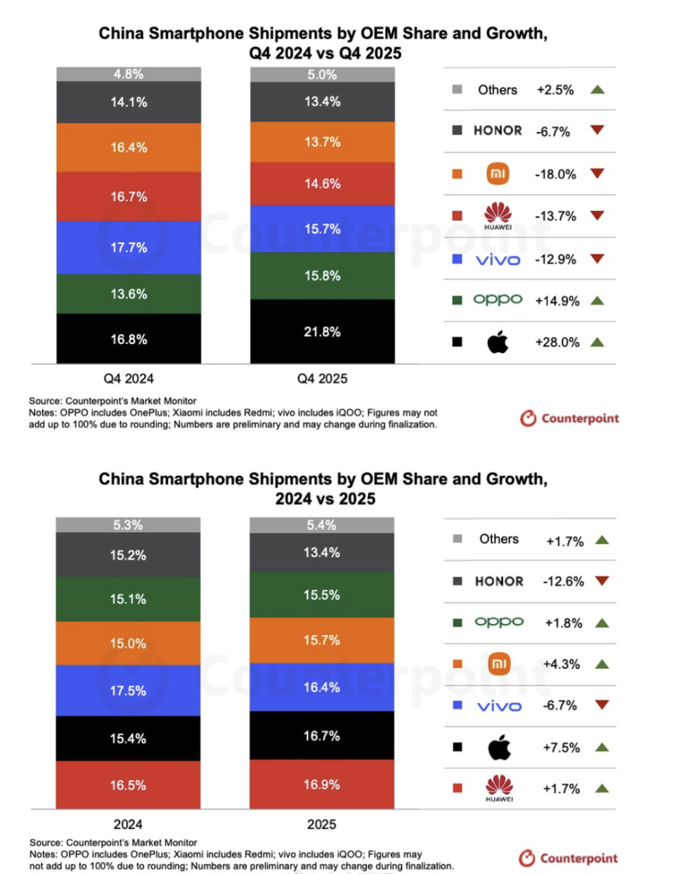 华为又回来了!虽然整个2025年中国手机市场出货量微降了0.5%,但Counterpoint的数据显示,华为以近16.9%的份额再次拿下了年度第一。仔细想想,这份第一的含金量很足。它是在市场整体遇冷、其他品牌压力不小的背景下实现的,靠的是其深厚的品牌号召力和旗舰产品线扎实的吸引力。