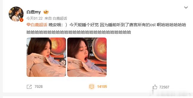 期待和李佩仪见面白鹿唱的唐宫奇案OST白鹿睡前听到了唐宫所有的OST 音符流淌间皆是盛唐探案画面,白鹿睡前循环唐宫OST,既盼歌手身份亮相,更念与李佩仪相见。