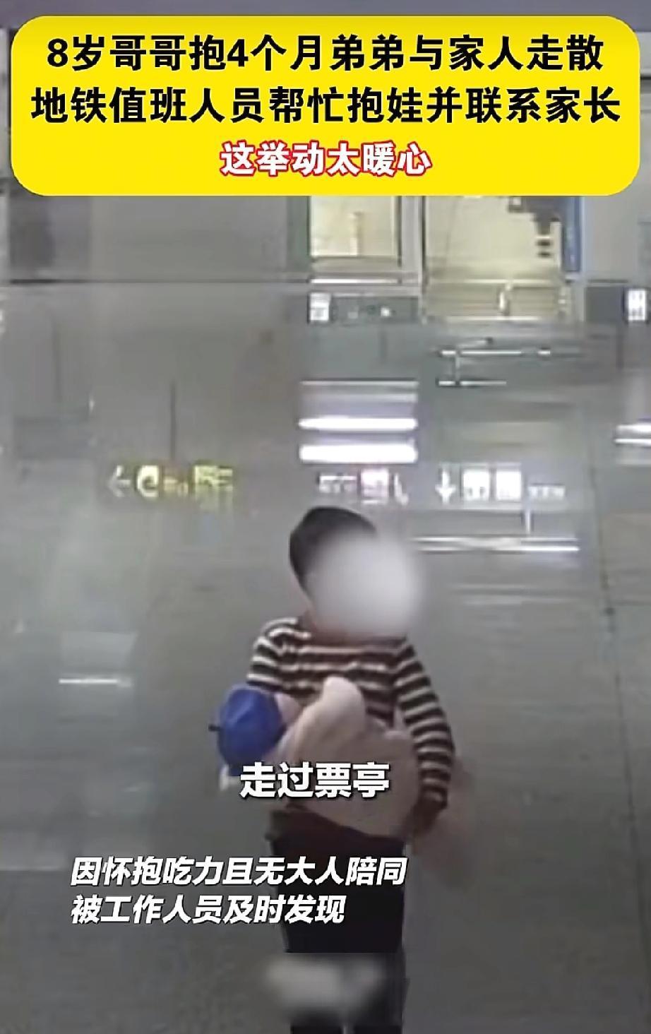 暖哭了!成都,一名8岁男孩抱着4个月大的弟弟独自出现在地铁东光站,身边没有大人。地铁工作人员发现后,一边帮男孩联系家长,一边化身“临时奶爸”照顾婴儿,最终孩子母亲赶来,对工作人员连连道谢。 在成都地铁东光站,监控拍到一个8岁的男孩,怀里抱着个4个月大的婴儿,经过票停,抱得明显有些吃力,身边却没个大人。 地铁工作人员发现这情况,赶紧上前询问。原来男孩与家人走散,帮忙联系家人,家人表示找不到孩子正在派出所查监控呢。 工作人员吴科赶紧搬来凳子让男孩休息,还接过弟弟,当起了“临时奶爸”,又是哄又是抱,特别细心。 大概二十分钟后,孩子的母亲着急忙慌地赶来了,看到两个孩子都好好的,拉着工作人员一个劲道谢。 有人说:“这哥哥小小年纪就有担当,工作人员也太暖心了!” 孩子的妈妈说:平时在家里抱两分钟就抱不动了!可这次8岁的哥哥抱着弟弟,那小身板看着就吃力,可还是努力护着弟弟,这份担当真让人感动。 地铁工作人员更是没话说,发现情况第一时间帮忙,还能耐心哄娃,这波操作太圈粉了!想想如果没人发现,两个孩子在地铁里多危险,还好有这些暖心的工作人员。 8岁哥哥的担当,是亲情的力量;地铁工作人员的暖心,是责任与善意的体现。在这个快节奏的时代,这样的画面特别治愈。 也提醒家长们,带娃出门可得看紧了,别让孩子离开自己的视线。同时,也为这些在平凡岗位上传递温暖的工作人员点赞,因为有他们,城市才更有温度。 万一孩子和家人走散了怎么办?这几招一定要记牢 首先孩子自己该做的: 待在原地别乱跑:走散后别慌张,就待在走散的地方,家长发现找不到你,大概率会回来找你。 找可靠的人求助:找穿制服的警察叔叔、商场或地铁的工作人员,他们会帮你联系家人。 记住关键信息:平时要记住爸爸妈妈的手机号、家庭住址,还有自己的名字,方便别人帮你。 其次家长该做的 原地等待+呼喊:先在走散的地方待着,大声喊孩子的名字,说不定孩子就在附近。 赶紧报警:如果过了一会儿还没找到,马上打110报警,告诉警察孩子的特征、穿着。 利用场所广播:在商场、车站这些地方,找广播室帮忙播报,让孩子听到后到指定地点找你。