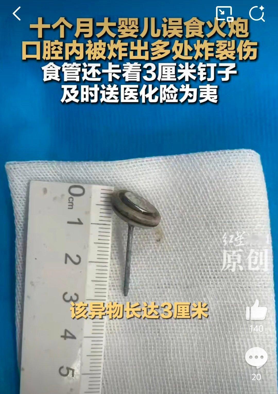 10月大婴儿误食鞭炮口腔炸伤小东西还是放在孩子够不到的地方孩子喉咙里面卡着3cm图钉家长也没有发现异常后面又误食火炮才去医院发现的