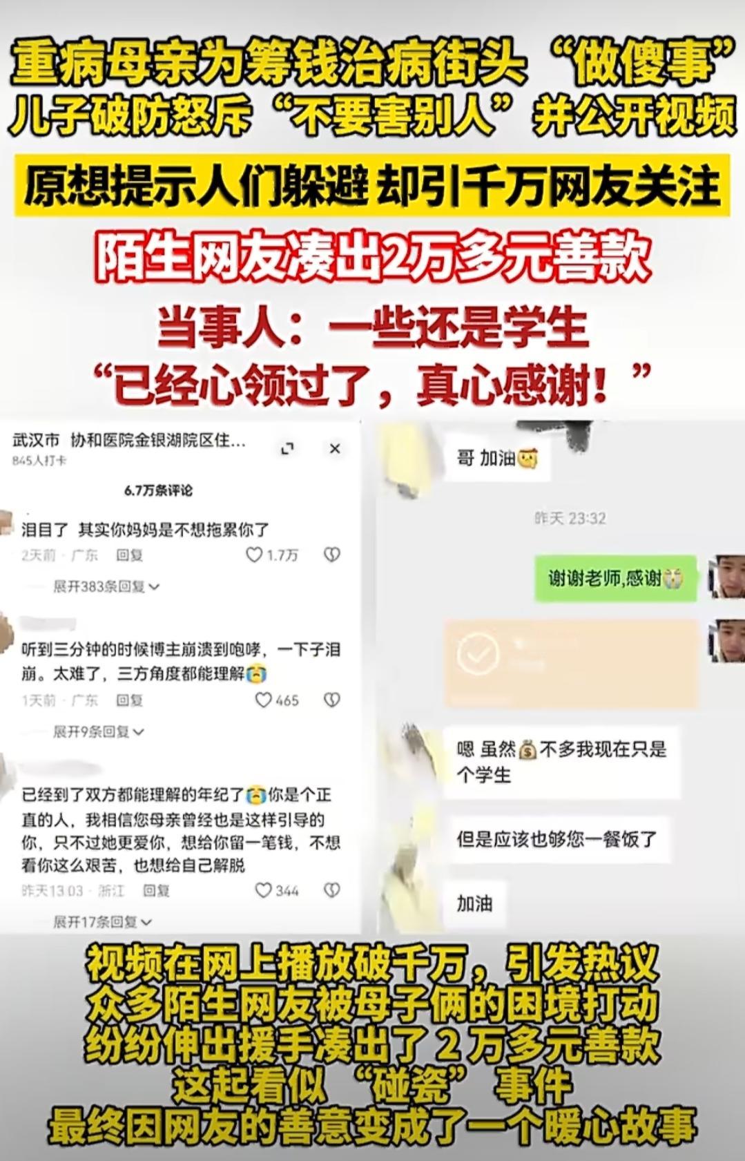 最近湖北武汉街头出了个又让人揪心又暖心的事儿,一开始看着像碰瓷,没想到最后反转成了正能量故事。64岁的阿姨得了口腔癌,治疗花了不少钱,这天趁着儿子不注意偷偷溜出家门,跑到马路上想“碰瓷”,结果被儿子当场怒吼“你不要害别人”,这段视频发到网上后,千万网友都看到了,大家你一块我十块地帮忙凑钱,最后凑出了两万多治疗费。 这事里的儿子熊先生,从小就是单亲家庭长大,跟着妈妈过,爸爸是黄石矿产相关企业的退休工人,离婚后独自生活,现在经济条件和身体都不太好,所以妈妈生病后一直是他在独自照顾。妈妈去年确诊口腔癌后,已经做了好几次治疗,家里的经济压力一直很大。 那天熊先生正在家里准备中饭,回头发现妈妈不在家,等了半天也没回来,心里就开始着急了,赶紧给妈妈打电话,结果接电话的是交警。交警说路上有个老人可能被货车撞了,老人口齿不清还口吐白沫,脸部因为手术变形,手机解锁不了,正到处找家属呢。熊先生一听就慌了,虽然觉得妈妈平时不会跑到一公里外的马路上去,但又怕真出了意外,赶紧跟着救护车把妈妈送到了医院。 到了医院急诊科检查后,发现老人就只是脚腕磕了一下,没什么大碍,熊先生这时候就有点怀疑了——之前妈妈就因为治疗费的事儿,提过想碰瓷的念头。后来他去交警队看了监控,确认货车根本没撞到妈妈,这才肯定妈妈是故意碰瓷的。在病床前,熊先生忍不住追问妈妈:“别人说没撞倒你,你是不是碰瓷?骗人是没用的,到处都是监控,要是你自己摔的,治疗费都得自己出,你可别祸害别人啊!” 老人一开始还含糊不清地辩解,说自己就是从那儿经过,没碰瓷。熊先生又急又气,情绪激动地吼了起来:“你怎么能做这种事?跟你说过多少次了,不许搞这个!”等回到出租屋,熊先生还是没忍住继续“教训”妈妈:“你为啥要去害别人?是想讹钱还是碰瓷啊?”这时候老人才松了口,含糊地承认就是想让别人赔钱,还说“我想他有保险,就动了歪心思,就是想搞钱治病”。 熊先生看着妈妈也心疼,但还是跟她讲道理:“别人也有家庭要养,你怎么能这么祸害人家呢?”老人听了也知道自己错了,在视频里说自己太坏了,连救护车的费用自己支付都是活该。熊先生说,之前就一直劝妈妈别做害人的事,这次虽然妈妈受了教训,但生病的老人想法说不定什么时候又会跑偏,所以他干脆把视频发了出去,想让大家看到后能多留意,避开类似的情况,没想到视频一上网就火了,千万网友看到后都伸出了援手,你50我10块地凑起了治疗费,最后一共凑了两万多,算是解了燃眉之急。【