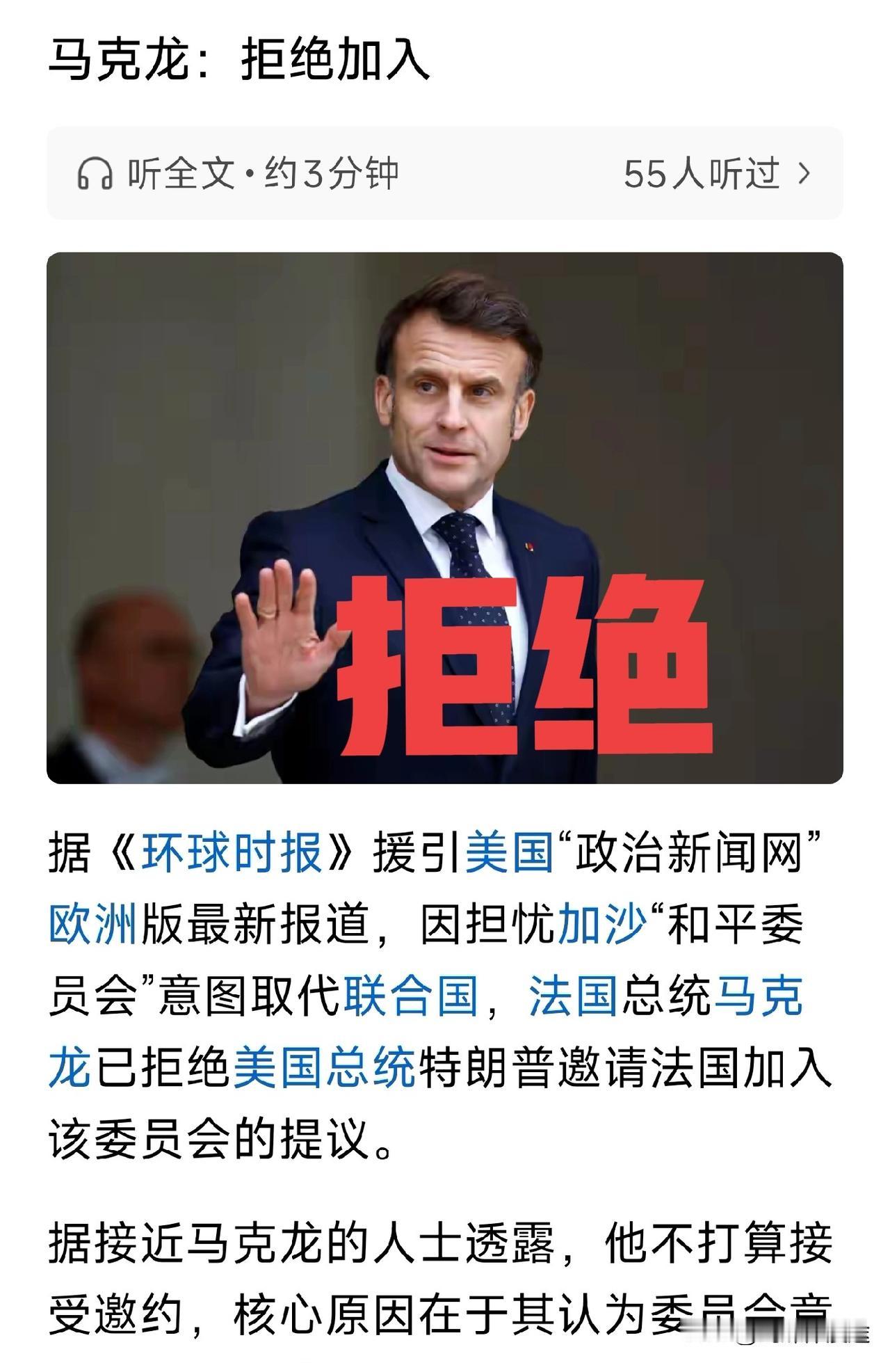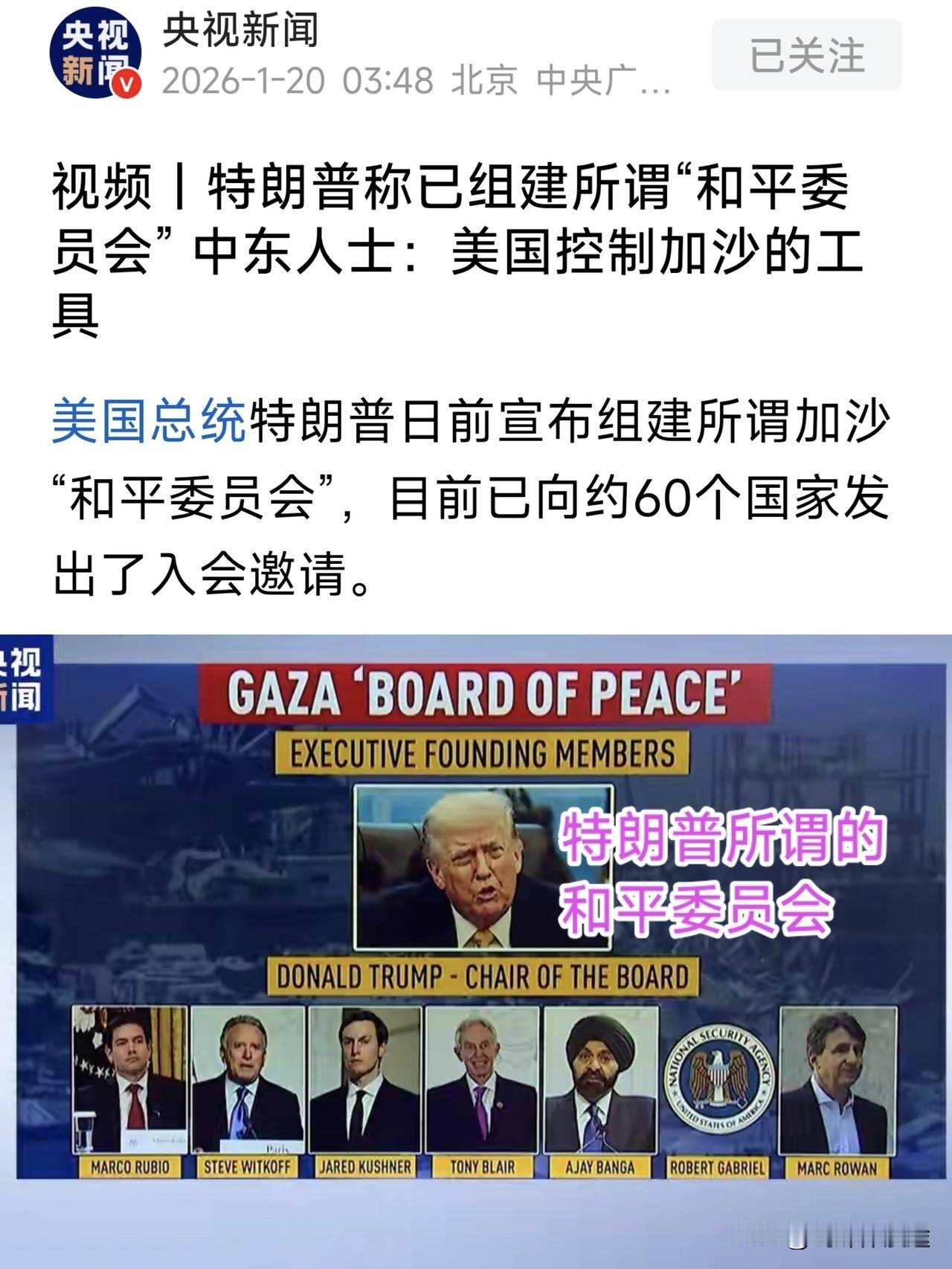 特朗普组建所谓“和平委员会”向 60 国发出邀请,法国第一个表示:不参加!俄罗斯表示:正在审议当中......! 特朗普以调停加沙冲突为由 建立的所谓“和平委员会”,特朗普自任为主席,而美国为创始执行委员会的7名成员中,6人是美国人,包括美国国务卿鲁比奥、总统特使威特科夫、前白宫高级顾问特朗普的女婿库什纳等。同时特朗普向加入此委员会的国家要价 10 亿美元加入费。 特朗普组建的“和平委员会”除了加沙地区之外,包括世界上所有地区的冲突,这完全有意挑战联合国的地位之举! 全世界都知道,这个世界上所有大大小小的冲突,美国直接或间接的介入其中,美国其实就是这个世界乱源,而如今还要组建所谓的“和平委员会”调停世界的冲突,这岂不是自当小偷又当警察吗?美国一家说了算。这原本就是霸权的行径。所以这样的“和平委员会”就是美国一家说了算了“团伙”作案工具,谁愿意成为这个委员会的成员或作案工具呢?再掉进这样的“坑”里 又是一个难以自拔的困局,最后进去容易出来难,上了贼船 要下船那就是要被美国再威胁一次。 如今法国第一个跳出来不参加这样的“和平委员会”,马克龙深知美国背后的阴谋。19日法国外交部巴罗发表声明指出,总统马克龙认为由特朗普主导的“和平委员会”已超出管理加沙的职责范围,担心会破坏联合国的框架,降低联合国的国际事务中应有的作用,因此拒绝加入。 对于咱们中国来说,中国是一个护维联合国宪章的主要担当国家,更不会容许“和平委员会”挑衅联合国的地位。中国也不会参与!