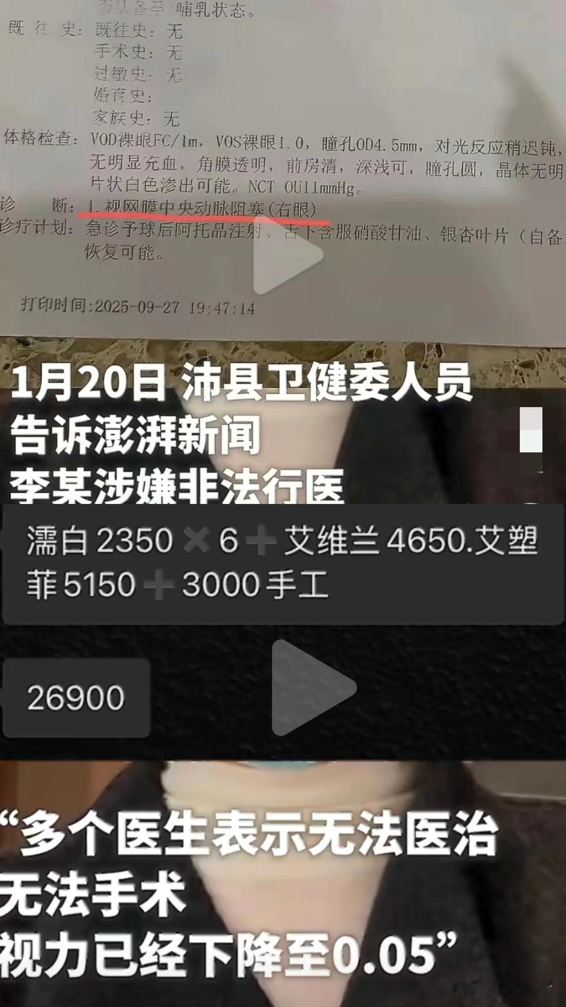 25万换来的视力0.05:非法医美的“致命美丽”陷阱 近日,江苏徐州沛县一起非法医美事件引发关注:曾女士轻信自称“整形专家”的李某,支付近25万元进行脸部医美项目,结果因违规注射导致右眼视力急剧下降至0.05,几近失明。当地卫健委确认李某涉嫌非法行医,案件已移交警方。 据报道,曾女士为追求美丽跨省求医,对李某的“专家”身份深信不疑。然而,所谓的“专家”实则并无合法行医资质,一次违规注射操作直接导致曾女士右眼视网膜中央动脉阻塞,造成不可逆的视力损伤。 真正的美丽从来不应以健康为代价。选择医美服务前,请务必核实机构与人员的资质,警惕过分夸大的宣传与不合常理的低价。美丽可以追求,但生命与健康只有一次。正如这起案例所警示的:一次轻率的决定,可能换来一生无法弥补的伤害。在追求美丽的道路上,谨慎不是多虑,而是对自己最基本的负责。