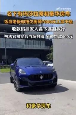 不要个脸了!上海一饭店老板名下有玛莎拉蒂和豪华房车,却拖欠厨师7000元工资不给,依法拘传后,当场付清工资。 昨天,上海一家饭店的老板吴某被法官堵在了自己的厨房里。之前,他名下有玛莎拉蒂和豪华房车,却一直拖着厨师7000块的工资不给。为了躲债,他甚至还把店里的收款码挂到了家人名下,想着这样法院就查不到、扣不了他的钱。 这案子到了法院,法官打电话给他核实情况。吴某在电话那头信誓旦旦地说,自己人在浙江舟山,正忙着进海鲜呢,一时半会回不去。结果话音落下没多久,执行法官直接来到他的饭店,正好撞见他本人在店里指挥备菜,忙得“不亦乐乎”。 这谎撒的当场被戳穿,法官可没客气,依法将他拘传。到了法院,在法律的威慑下,吴某再也“硬气”不起来了,当场就把欠厨师的7000元工资结清了。 鉴于他付清了钱,认错态度也还行,法院提前解除了原本对他作出的十日司法拘留决定,但另外罚了他500块钱。这事算是个警钟,告诉大家法律的执行力是实实在在的。 一边是百万豪车开着,一边是连几千块的工钱都要赖掉,这对比也太刺眼了。对于辛苦干活的厨师来说,7000块可能就是等着交的房租、孩子的学费、一家老小的生活费。这位老板的行为,寒的是干活人的心。 不过话说回来,这次法院的处理真的很给力。从法官“突击”饭店抓现行,到让他马上掏钱,整个过程雷厉风行。这也应了最近最高法开会强调的,对于拖欠工资这类民生案子,要“依法快调、快审、快判、快执”。看来这话不是白说的,基层法院确实在这么做,让老百姓能看到“纸上判决”快速变成“真金白银”。 为法官点赞!对付这种人就得这样,不给他点实质性的教训,他下次还敢。