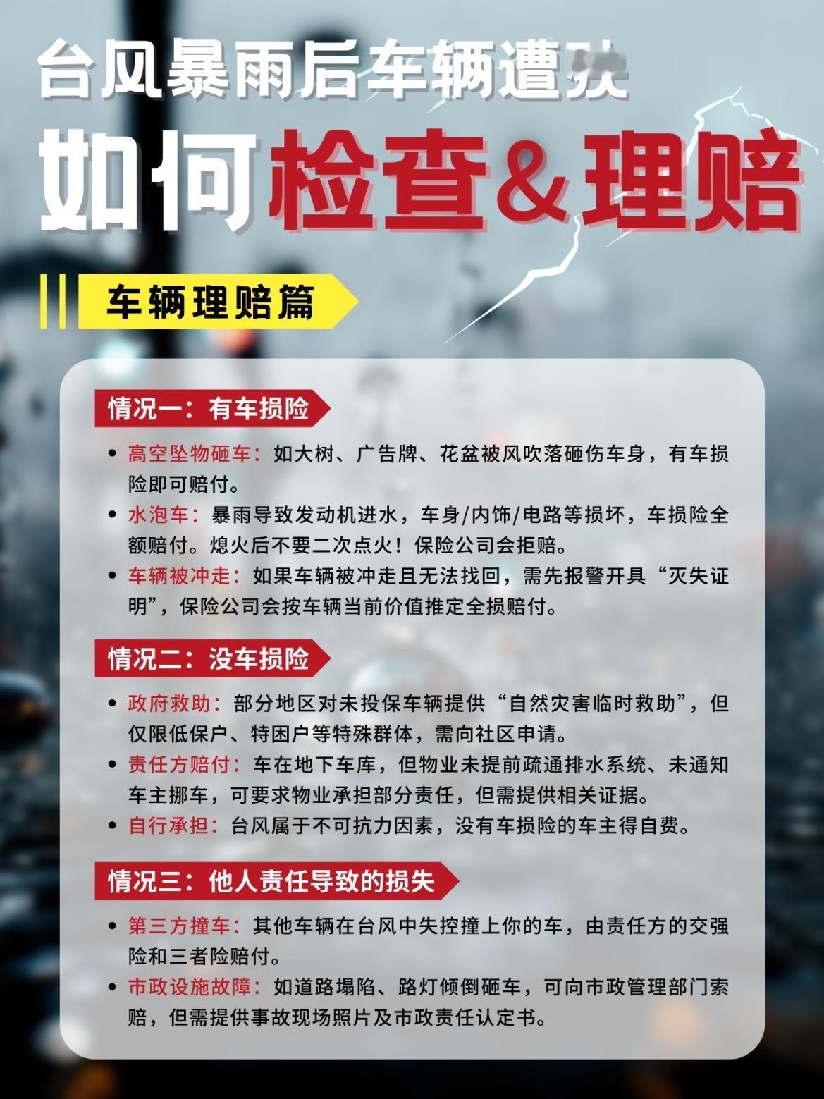 面对泡水车、车被树枝砸伤等问题,车主该如何要求理赔?宝子们看这篇!✅车辆理赔有车损险:高空坠物砸车、水泡车、车辆被冲走等可全额赔。没车损险:通常需要自行承担,有特殊情况可找责任方赔一部分。🔍台风后必做检查1️⃣外观:清理杂物、检查漆面。2️⃣底盘:看泥沙/水浸痕、检查螺丝/橡胶。3️⃣发动机:检查链条、空滤、机油状态。4️⃣其他:散热器有无异物、内饰地毯是否积水、车灯车窗是否正常等。注意——宝子们在台风过后尽快去洗车!台风天的雨水带盐分和酸性物质,晒过之后超伤车漆我与汽车的日常大v聊车