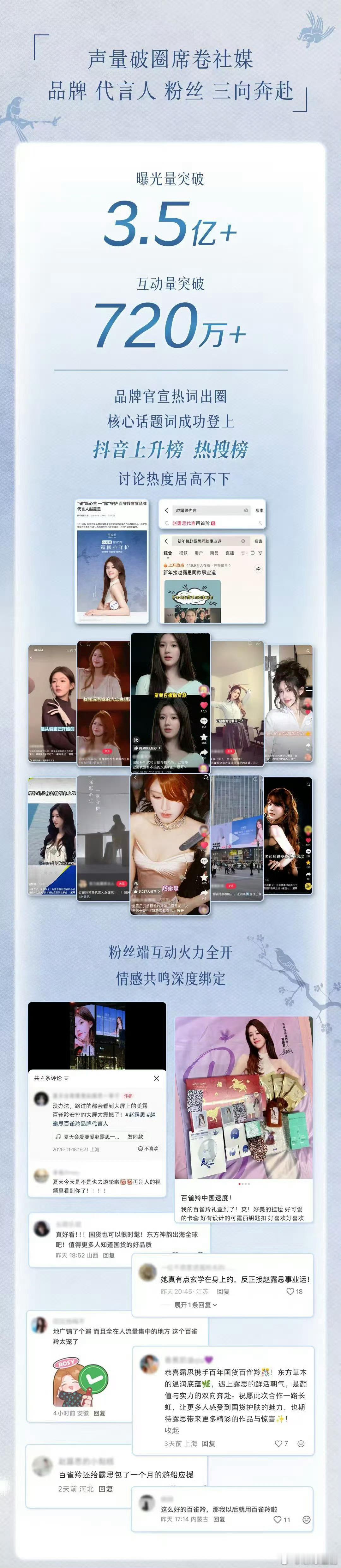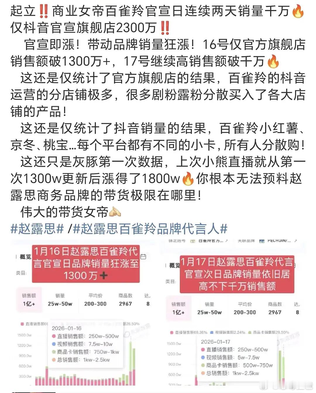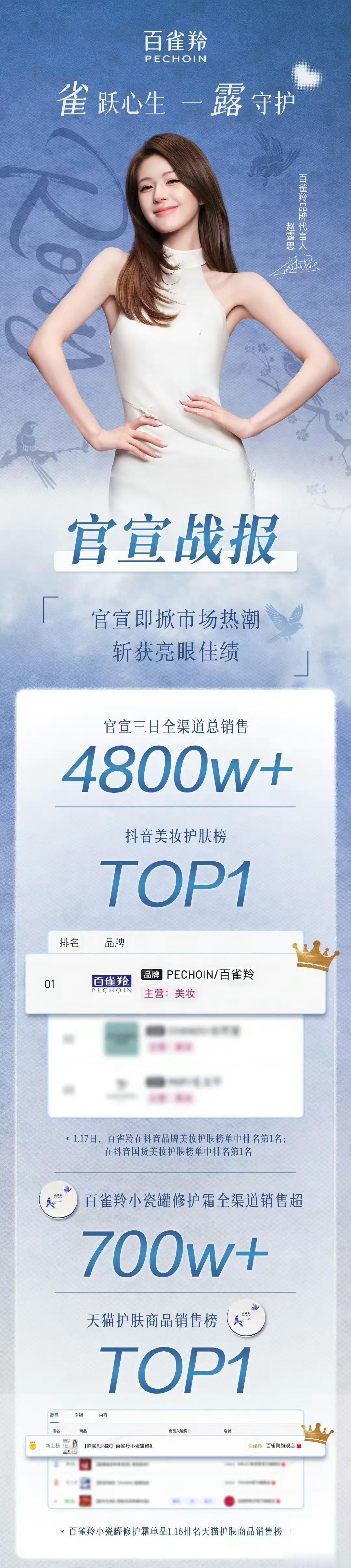 继chuu、小熊、超自然之后赵露思官宣百雀羚继续带动销量展示带货能力🔥官宣三日全渠道总销售 4800w+🔥抖音美妆护肤榜 TOP1🔥百雀羚小瓷罐修护霜全渠道销售超 700w+🔥天猫护肤商品销售榜 TOP1🔥1.17日,百雀羚在抖音品牌美妆护肤榜单中排名第1名🔥抖音国货美妆护肤榜单中排名第1名说白了赵露思的带货能力已经不局限于饭圈了 路人看了也想买