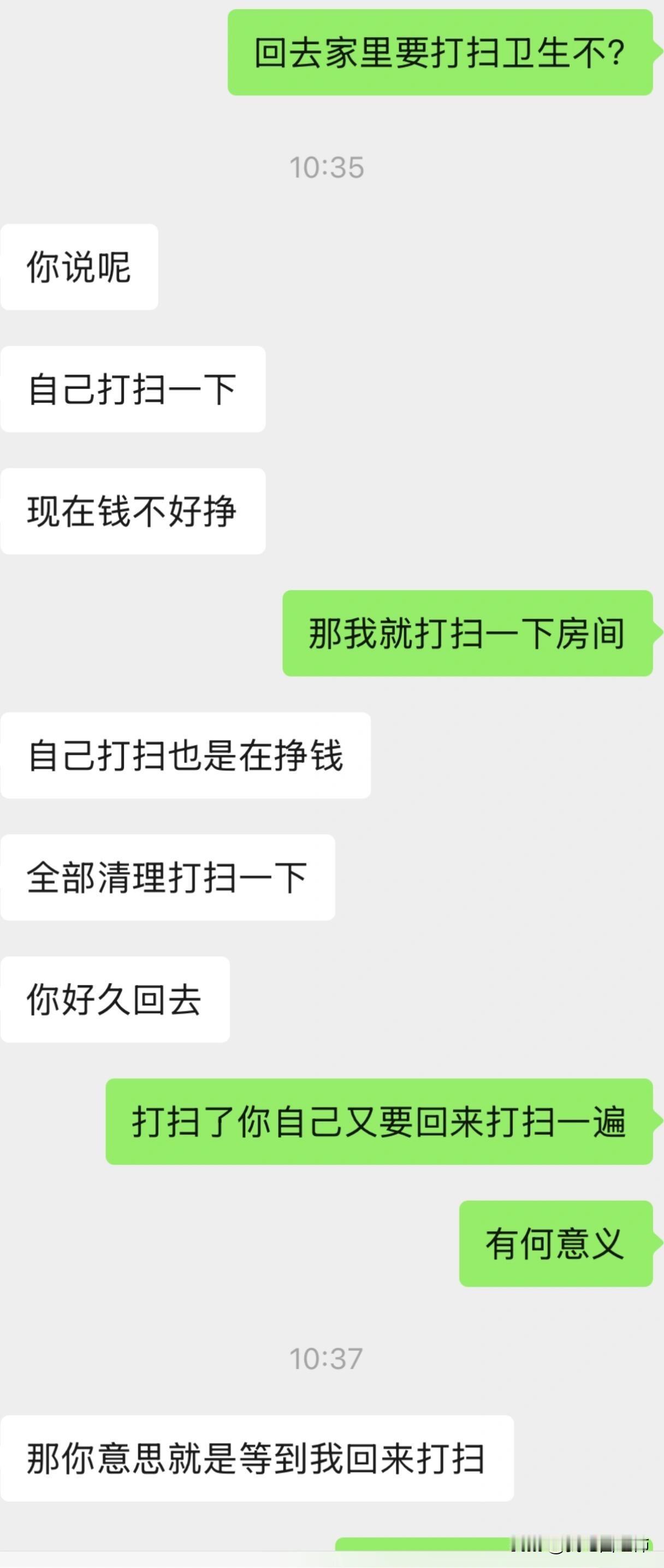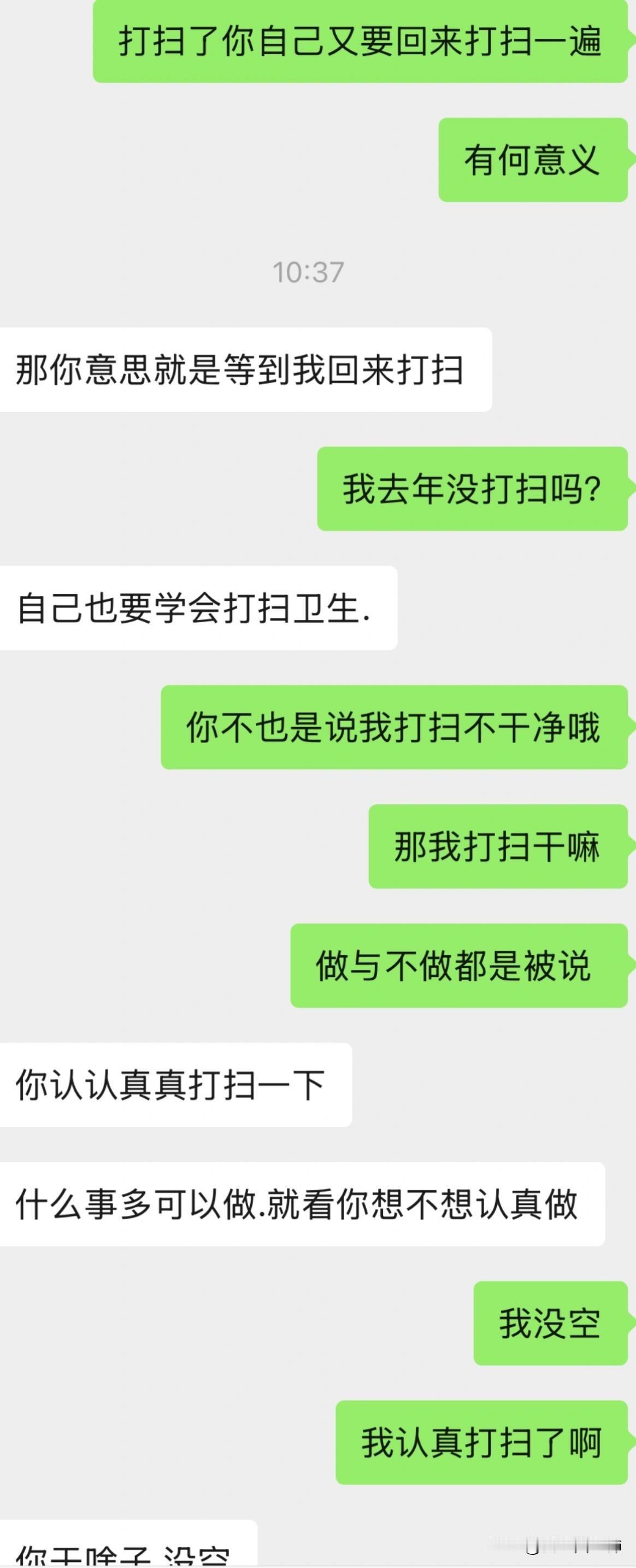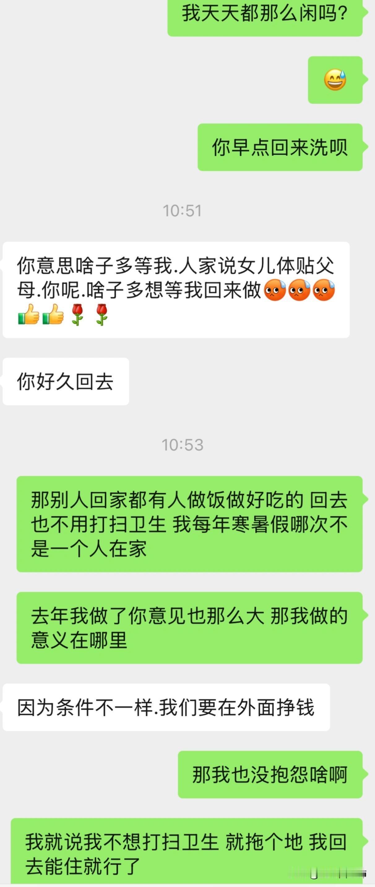 妈 请你不要再pua我了 我已经不是高中生了 本人大三基本上每年寒暑假都是自己一个人在家 ,父母只有过年前几天才会回家,每次回家都是一种噩梦因为家里长期没忍住并且是老旧小区经常会有老鼠,每次回去家里都很脏。作为一个女生我是比较怕老鼠的,但每一次都得被迫自己一个人打扫卫生,去年自己认真地打扫了卫生结果我妈刚到家就开始指责我家里没收拾干净,我特别委屈,做与不做都要被说那今年不如不做。而且家务也不是我一个人的任务,大家过年都要回家,为什么就要指使我一个人呢?我哥我嫂子大年三十那天才回来只用等着吃饭就行了,就因为我还没毕业上班所以理所应当让我做。别人都觉得家是避风港只有我觉得家是让我很窒息的地方。过年是吃不到自己喜欢的饭菜的,每次放假是自己要回去收拾烂摊子的。我妈最后一个从家里走 冰箱是不收拾的 电饭煲里是要留着饭让我三四个月自己收拾的。大家怎么看这种事情?感觉自己又对又错……