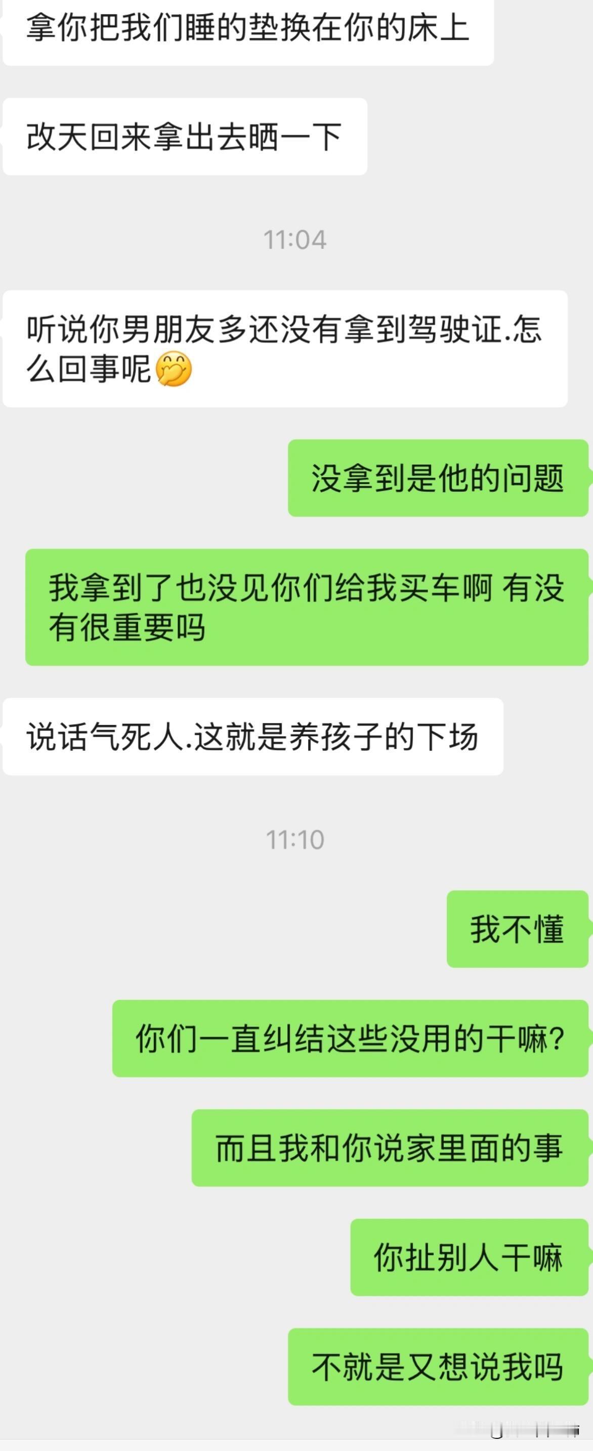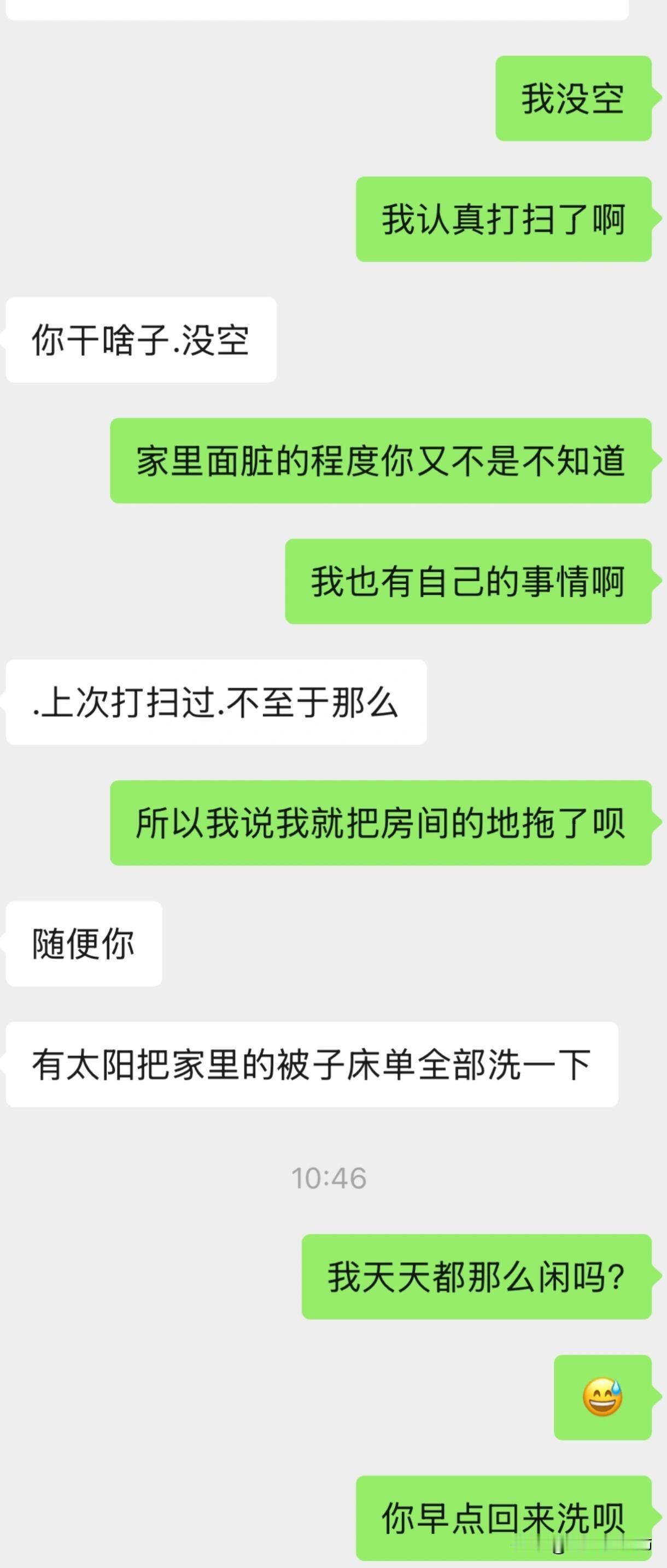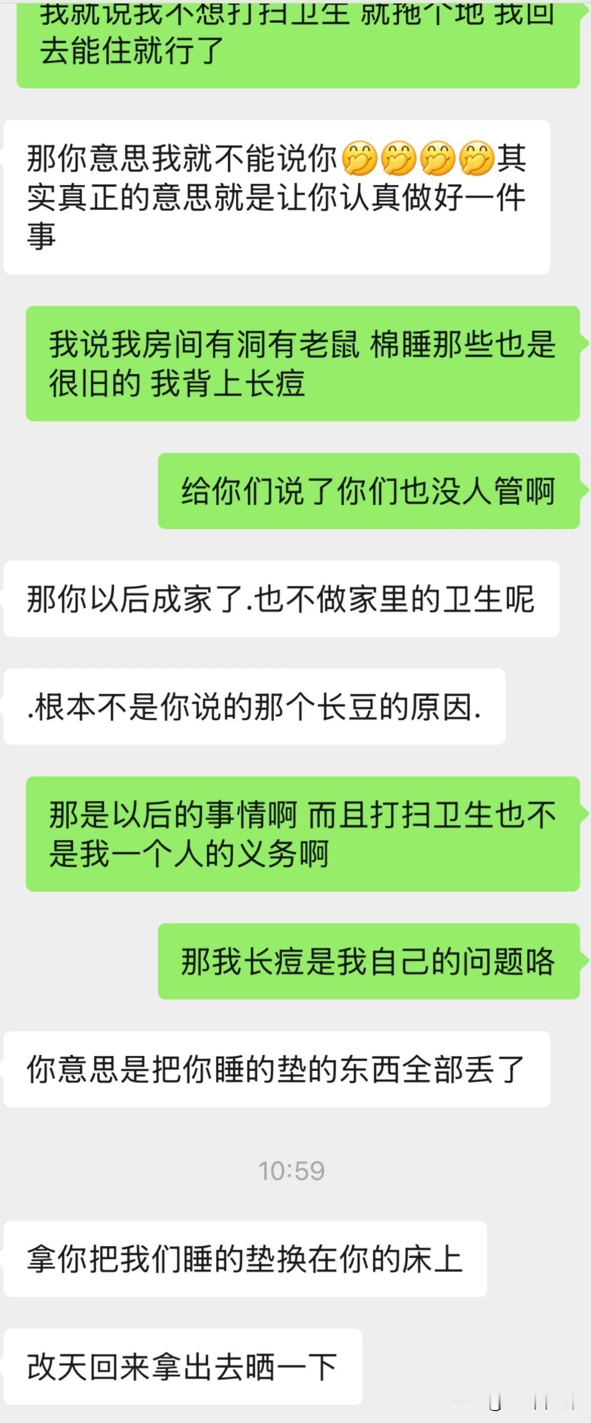 妈 请你不要再pua我了 我已经不是高中生了 本人大三基本上每年寒暑假都是自己一个人在家 ,父母只有过年前几天才会回家,每次回家都是一种噩梦因为家里长期没忍住并且是老旧小区经常会有老鼠,每次回去家里都很脏。作为一个女生我是比较怕老鼠的,但每一次都得被迫自己一个人打扫卫生,去年自己认真地打扫了卫生结果我妈刚到家就开始指责我家里没收拾干净,我特别委屈,做与不做都要被说那今年不如不做。而且家务也不是我一个人的任务,大家过年都要回家,为什么就要指使我一个人呢?我哥我嫂子大年三十那天才回来只用等着吃饭就行了,就因为我还没毕业上班所以理所应当让我做。别人都觉得家是避风港只有我觉得家是让我很窒息的地方。过年是吃不到自己喜欢的饭菜的,每次放假是自己要回去收拾烂摊子的。我妈最后一个从家里走 冰箱是不收拾的 电饭煲里是要留着饭让我三四个月自己收拾的。大家怎么看这种事情?感觉自己又对又错……