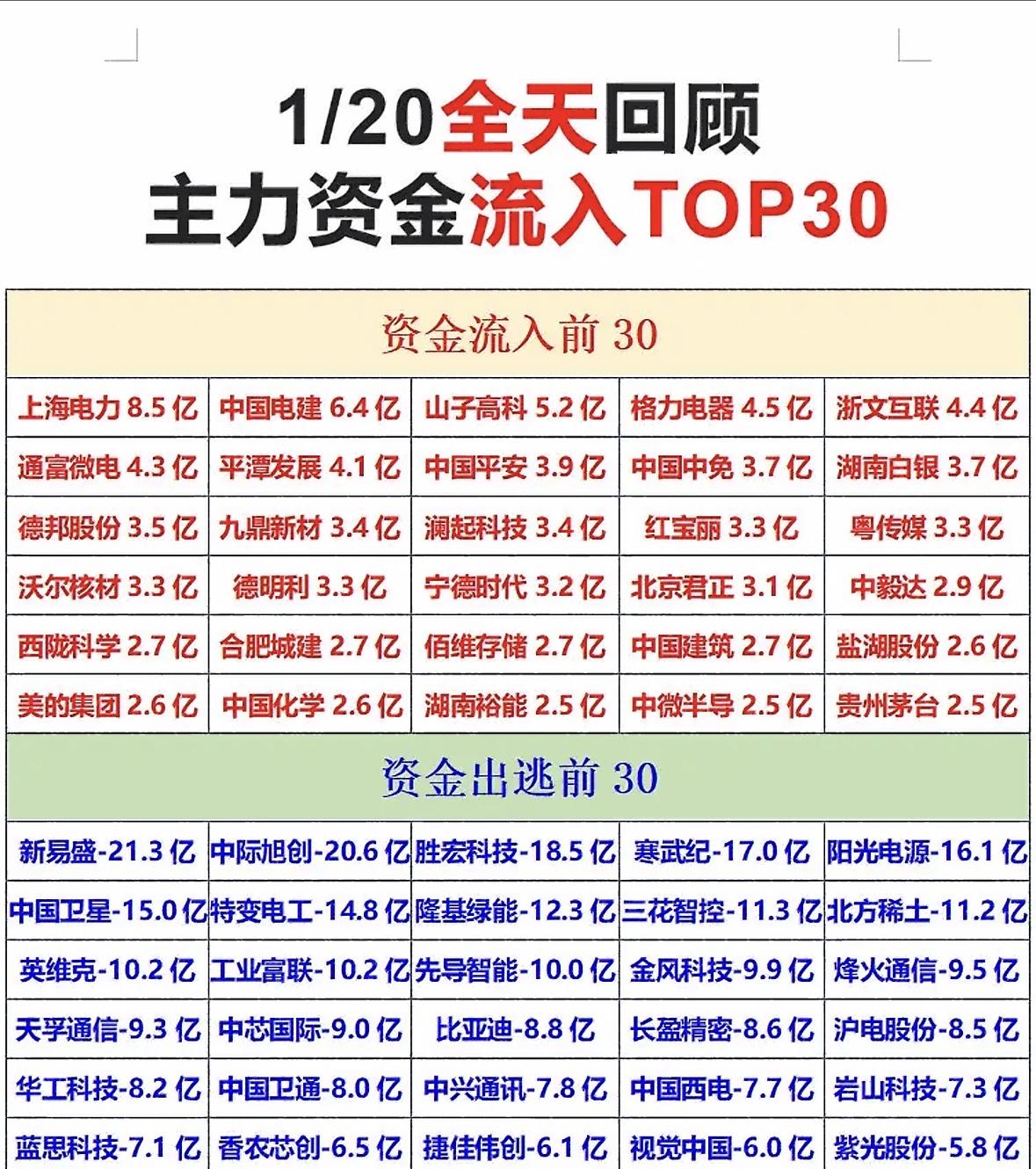 “1/20 主力资金流入TOP30”,带你揭秘资本市场大动作! "电力龙头吸金霸榜,科技白马集体失血!资金最爱上海电力,新易盛惨遭抛售,市场冰火两重天"