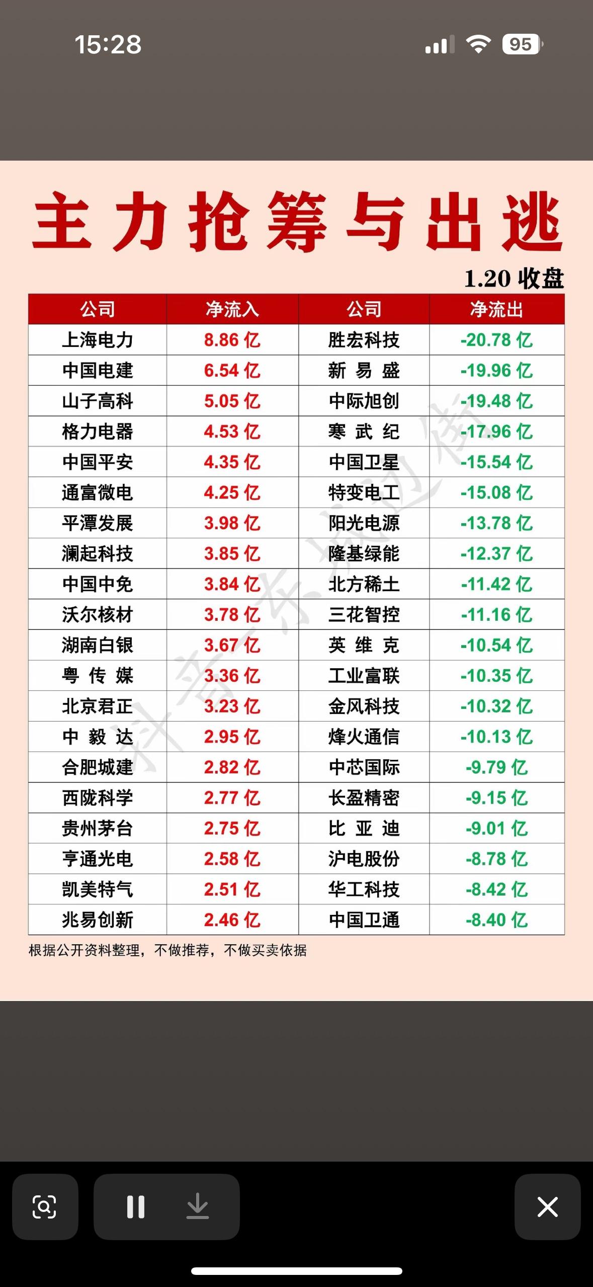 1月20日主力抢筹与出逃,股市风云变幻! 主力资金动向:上海电力等获抢筹,胜宏科技等遭抛售,市场分歧 主力资金动向:电力、科技股获青睐,新能源、半导体遭抛售,市场分化