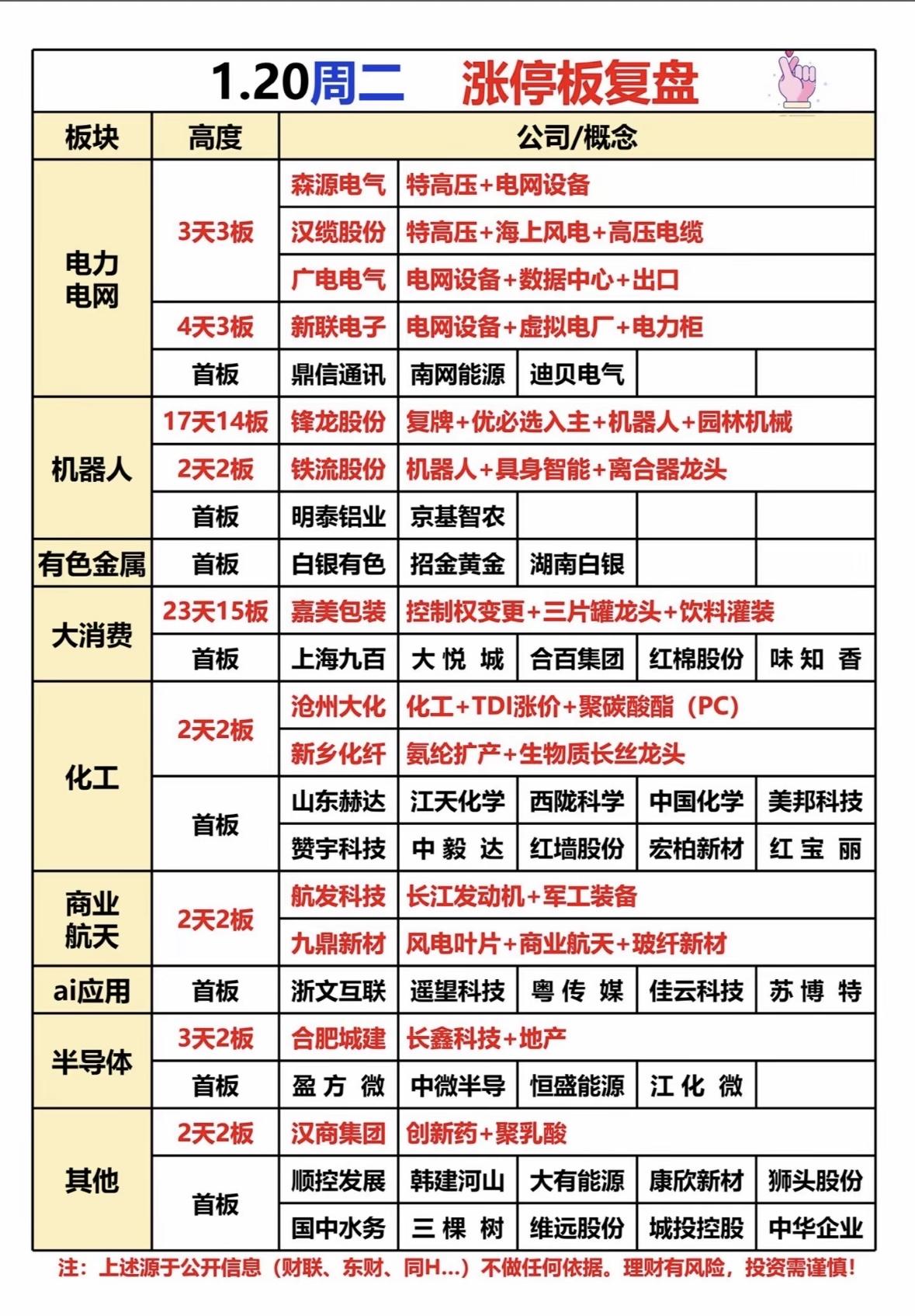 1月20日涨停板复盘 电力、机器人、有色金属等板块强势表现,快来抓住投资机会! 电力、机器人、化工板块活跃,多股连板涨停,市场热点轮动快,投资需谨慎把握节奏。