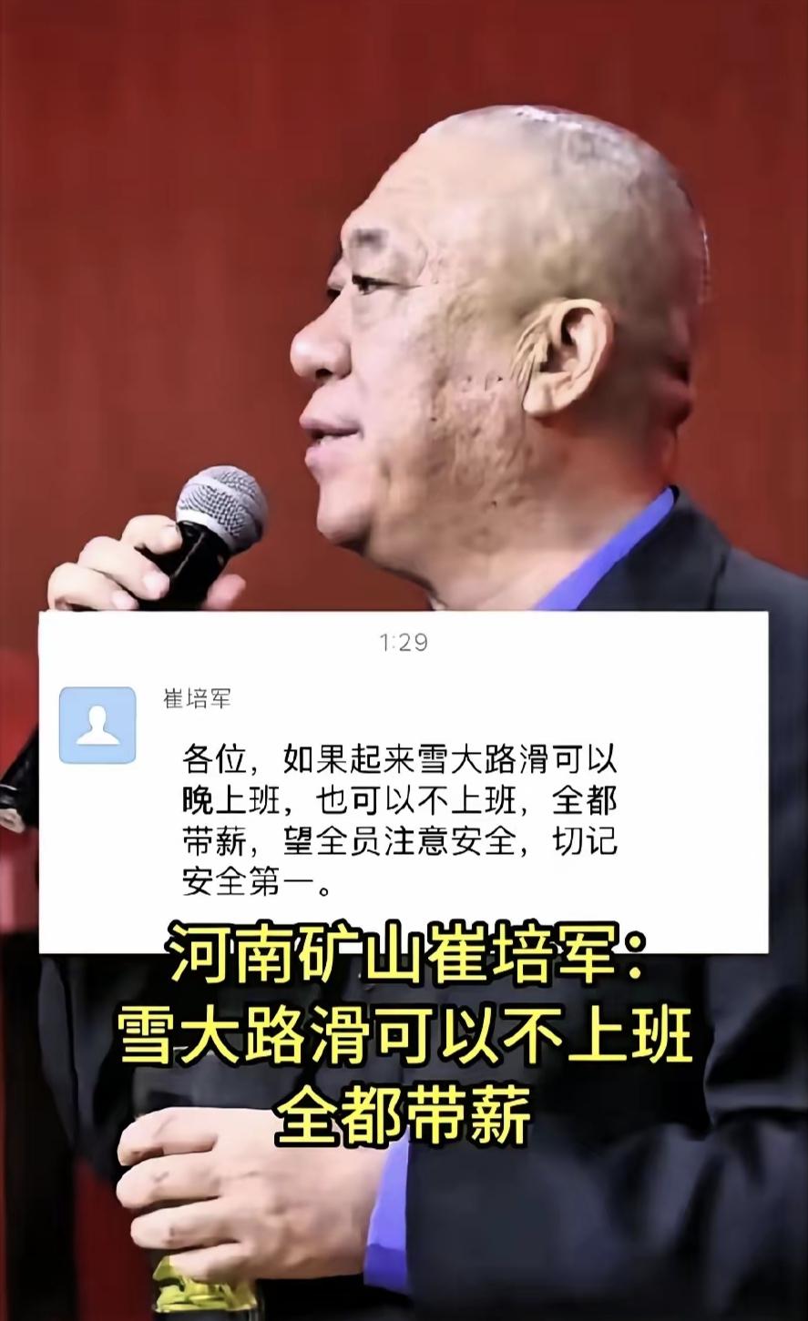 河南今天有中雪到大雪,河南矿山老总崔培军前一天在公司领导群里边发话:“各位!如果起来雪大路滑,员工可以晚来上班,也可以不上班,全部带薪。望全员注意安全,切记安全第一!” 这消息一出来,网友们直接炸了锅,评论区里全是羡慕的声音,都说这才是老板该有的样子!崔总这波操作可不是作秀,人家是真把员工的安全放在心坎上了。想想看,大雪天路有多难走,结冰的路面跟镜子似的,骑车开车都得提心吊胆,万一出点意外,不管是员工还是公司都得受损失。 崔总这话看着简单,实则暖到了员工骨子里。打工人最怕啥?怕天气不好还得硬着头皮上班,怕路上出点事扣工资,怕老板只盯着业绩不关心员工安危。可崔培军倒好,直接把“带薪不上班”的福利摆出来,还反复强调安全第一,这样的老板谁不乐意跟着干? 不是说所有老板都得这么做,但这份格局真的让人佩服。有些公司遇上恶劣天气,不仅不体谅员工,还催着按时到岗,迟到了还要扣钱,对比之下,崔总的做法简直是一股清流。员工心里暖了,干活自然更卖力,公司凝聚力也强了,这都是相互的。 而且崔培军是矿山老总,矿山行业本身就对安全要求极高,他能把这份安全意识延伸到员工日常通勤上,足以看出公司的管理理念有多正。现在网上总说“打工人难”,其实大家想要的不多,无非是被尊重、被体谅,崔总正好做到了这一点。 这事儿也给其他老板提了个醒,员工不是赚钱的工具,而是公司最宝贵的财富。多站在员工的角度考虑问题,少点苛刻要求,多点人文关怀,公司才能走得更远。 各位读者你们怎么看?欢迎在评论区讨论。崔培军