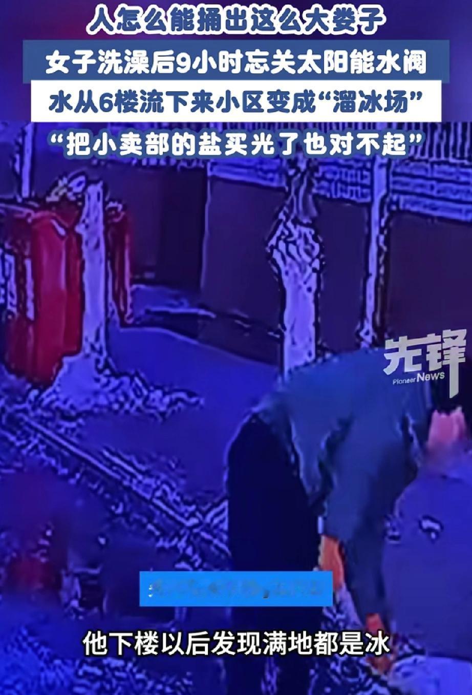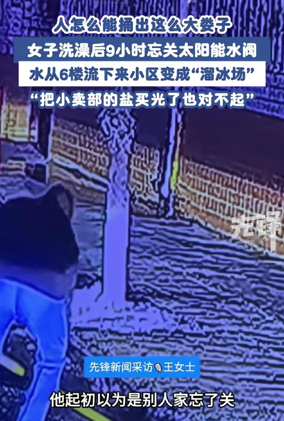 人怎么能捅出这么大娄子!甘肃兰州,一男子早起晨跑,结果却发现不知道谁家漏水让小区里面都结冰了,像个大溜冰场。他气愤地回家查看,结果发现“罪魁祸首”竟是自家女儿——她洗澡后忘关太阳能上水阀,水流了整整九个小时!一家人为了化冰,紧急行动,差点买光小区超市所有的盐。 据王女士说:前一天晚上,在家洗完澡,随手就忘了关太阳能的上水阀门,她没当回事,家人也没发现。结果水就这么源源不断地从阳台流出去,淌了整整一夜,足足9个小时。 第二天凌晨五点,王女士的父亲像往常一样早起晨跑,一出门直接傻眼了!小区里的路全结了冰,白花花亮晶晶的,跟溜冰场似的。 老爷子一边骂骂咧咧嘀咕是谁这么马虎,一边顺着水流找源头,结果一看,居然是自己家阳台!他赶紧跑回家叫醒女儿和妻子,一家三口顾不上吃早饭,拿着铁锹、扫帚就冲下楼。 父女俩在前头吭哧吭哧铲冰,母亲跟在后面撒盐化冰。可冰面实在太大,家里那点盐根本不够用,他们又赶紧跑到小区超市,把货架上所有的盐都搬回了家。 事后,王女士又愧疚又懊悔,她红着眼眶录视频向全体邻居道歉,坦言因自己的疏忽给大家出行带来大麻烦,并幽默又诚恳地致歉:“如果今早谁家没买到盐,可能是我家买走了,对不起!” 有人调侃:“这是现实版‘冰河时代’啊,一家之力‘打造’小区溜冰场!”就一个忘关阀门的小疏忽,居然闹出这么大动静,想想邻居早上出门看到溜冰场似的路,估计也很崩溃。 要我说,这事儿真让人捏把汗!一个小疏忽,差点引发大麻烦。冬天路面结冰,老人小孩万一滑倒摔伤,后果不堪设想。 幸好发现及时,一家人也全力善后,态度诚恳。居家过日子,细节真的能定乾坤。 睡前检查水电燃气,看似是小事,却能避免很多麻烦。一个人的小疏忽,可能会给一整个小区的邻居添乱。 更重要的是,犯了错不可怕,可怕的是逃避责任。王女士一家积极补救、主动道歉的样子,才是解决问题的正确打开方式。
